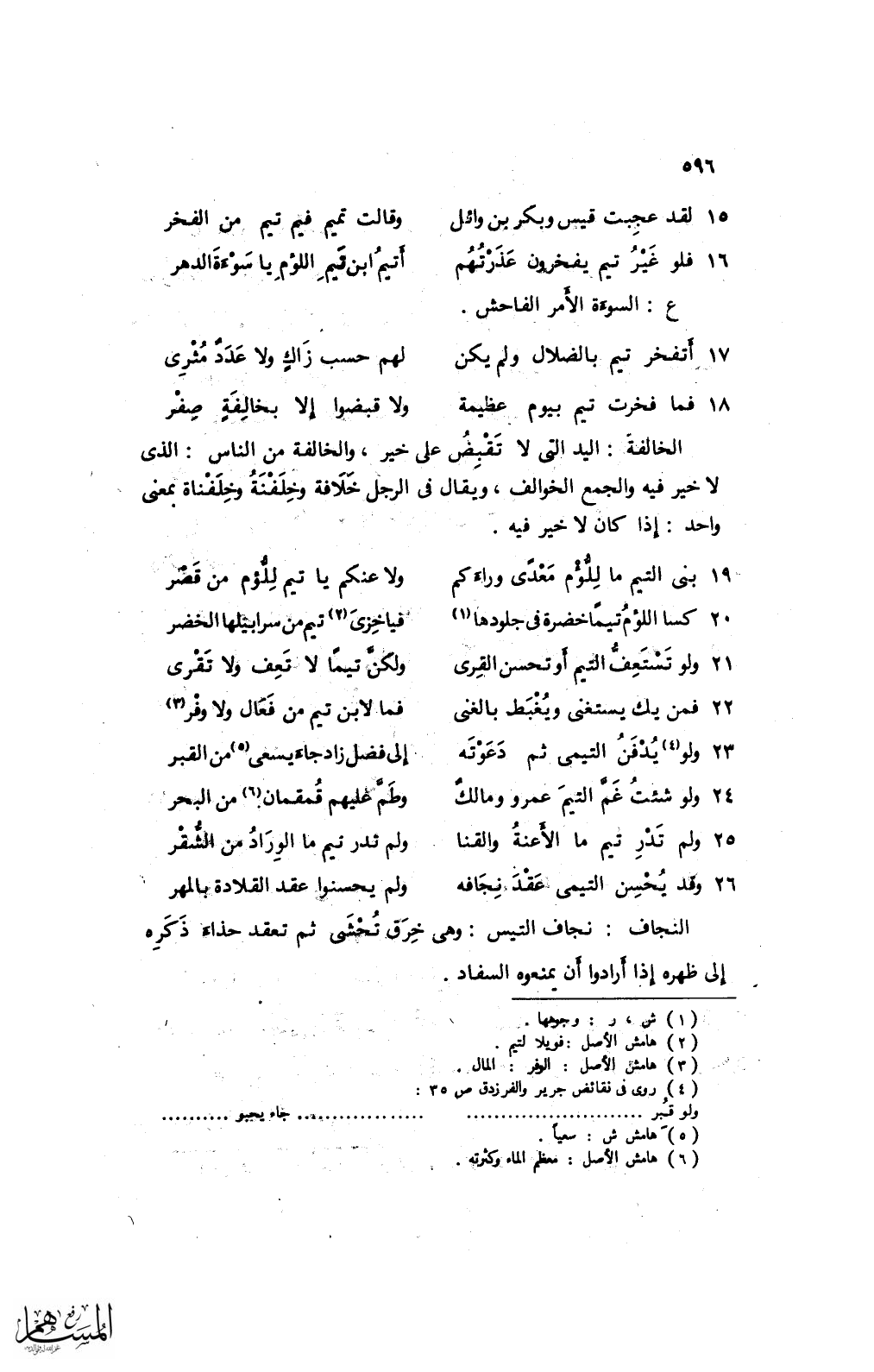 15 لقد عجبت قيس وبكر بن وائلٍ ... وقالت تميم فيم تيم من الفخر