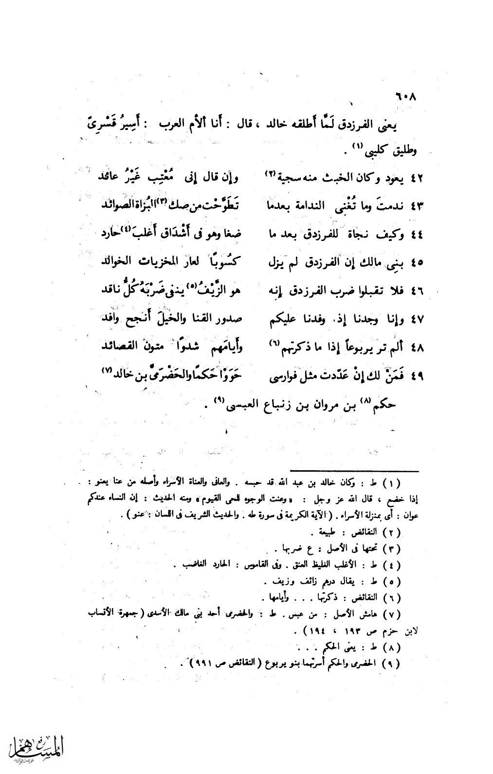 49 فمن لك إن عدّدت مثل فوارسي ... حووا حكمًا والحضرميّ بن خالد