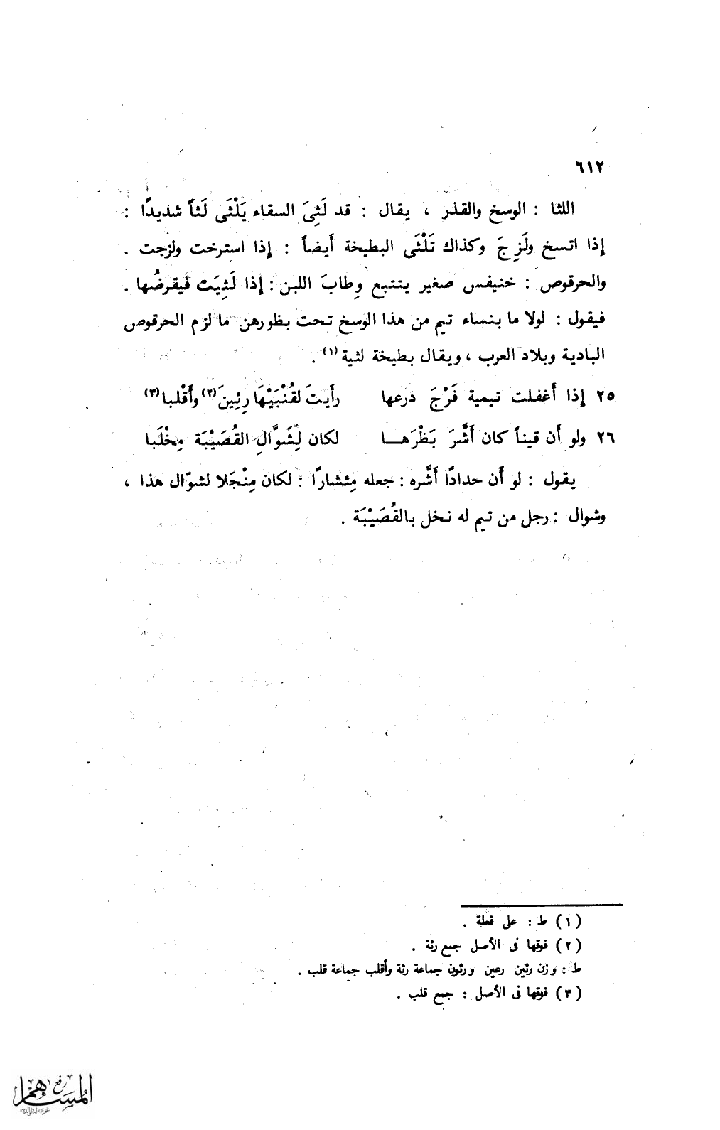 اللثا: الوسخ والقذر، يقال: قد لثي السقاؤ يلثى لثا شديدًا: إذا اتسخ ولزج وكذاك تلثي البطيخة أيضًا: إذا استرخت ولزجت. والحرقوص: خنفيس صغير يتتبع وطاب اللبن: إذا لثيت فيقرضها. فيقول: لولا ما بنساء تيم من هذا الوسخ تحت بظورهن ما لزم الحرقوص البادية وبلاد العرب، ويقال بطيخة لثية.
