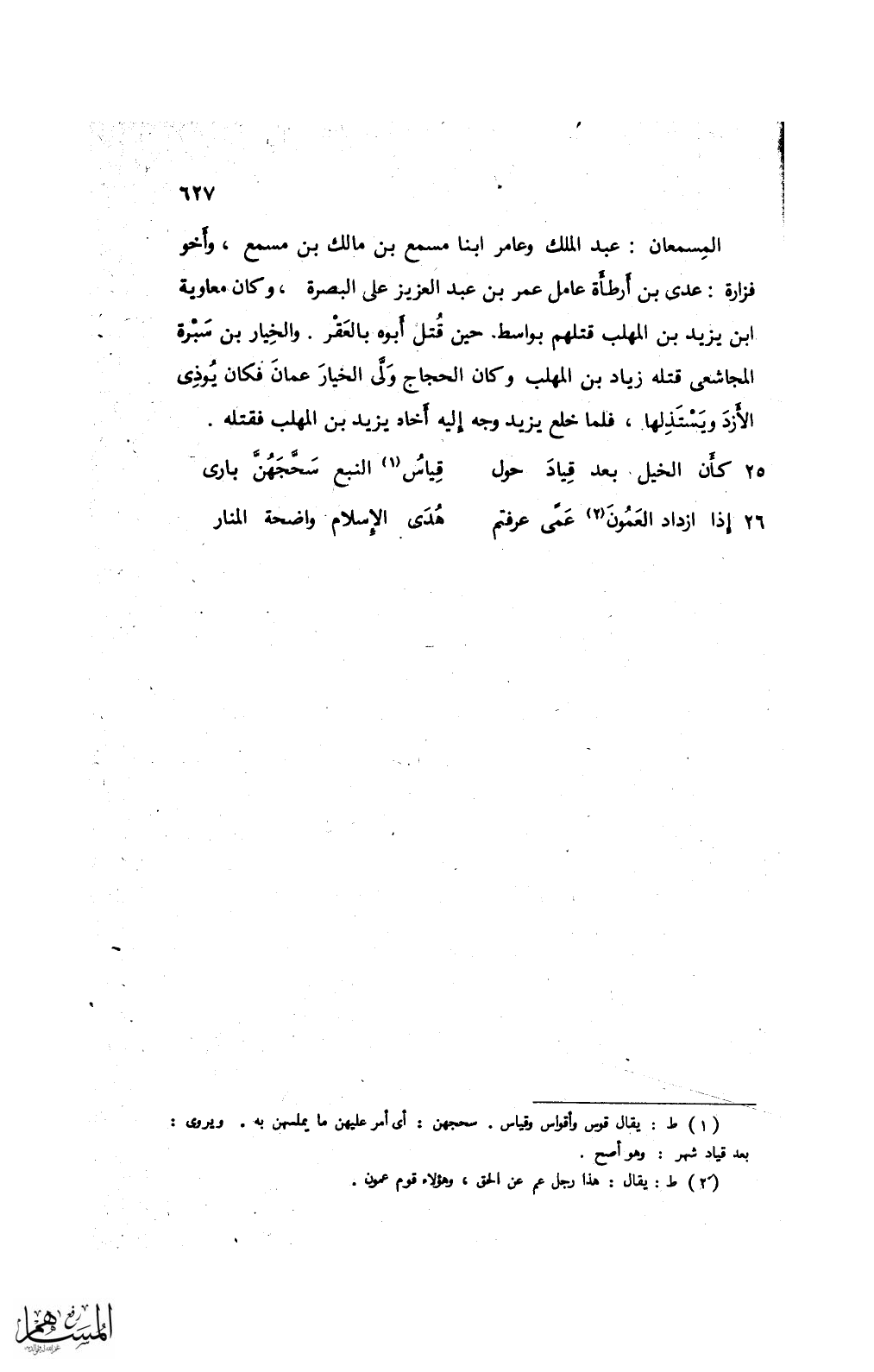 المسمعان: عبد الملك وعامر ابنا مسمع بن مالك بن مسمع، وأخو فزارة: عدى بن أرطأة عامل بن العزيز على البصرة، وكان معاوؤية ابن يزيد بن المهلب قتلهم بواسط. حين قتل أبوه بالعقر. والخيار بن سبرة المجاشعي قتله زياد بن المهلب وكان الحجاج وليّ الخيار عمان فكان يوذي الأزد ويستذلها، فلما خلع يزيد وجه إليه أخاه يزيد بن المهلب فقتله.