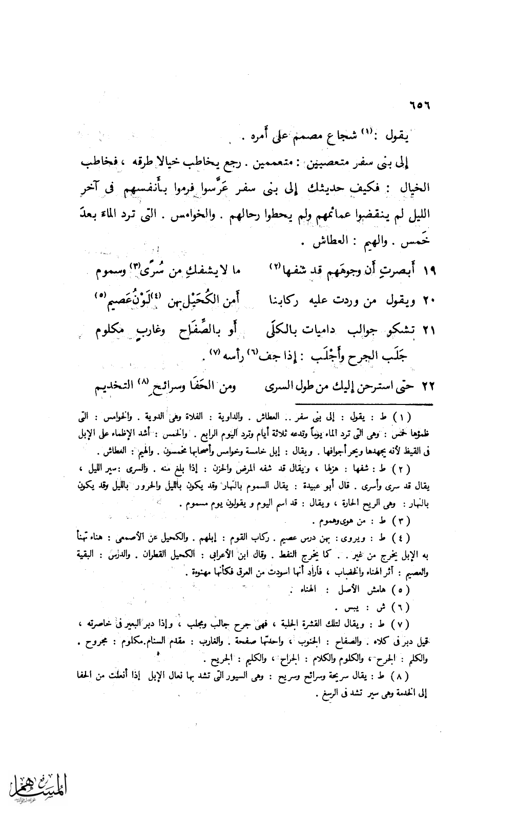 إلى بني سفر متعصبين: متعممين. رجع يخاطب خيالًا طرقه، فخاطب الخيال: فكيف حديثك إلى بني سفر عرسوا فرموا بأنفسهم في آخر الليل لم ينقضبوا عمائمهم ولم يحطوا رحالهم. والخوامس. التي ترد الماء بعد خمس. والهيم: العطاش.