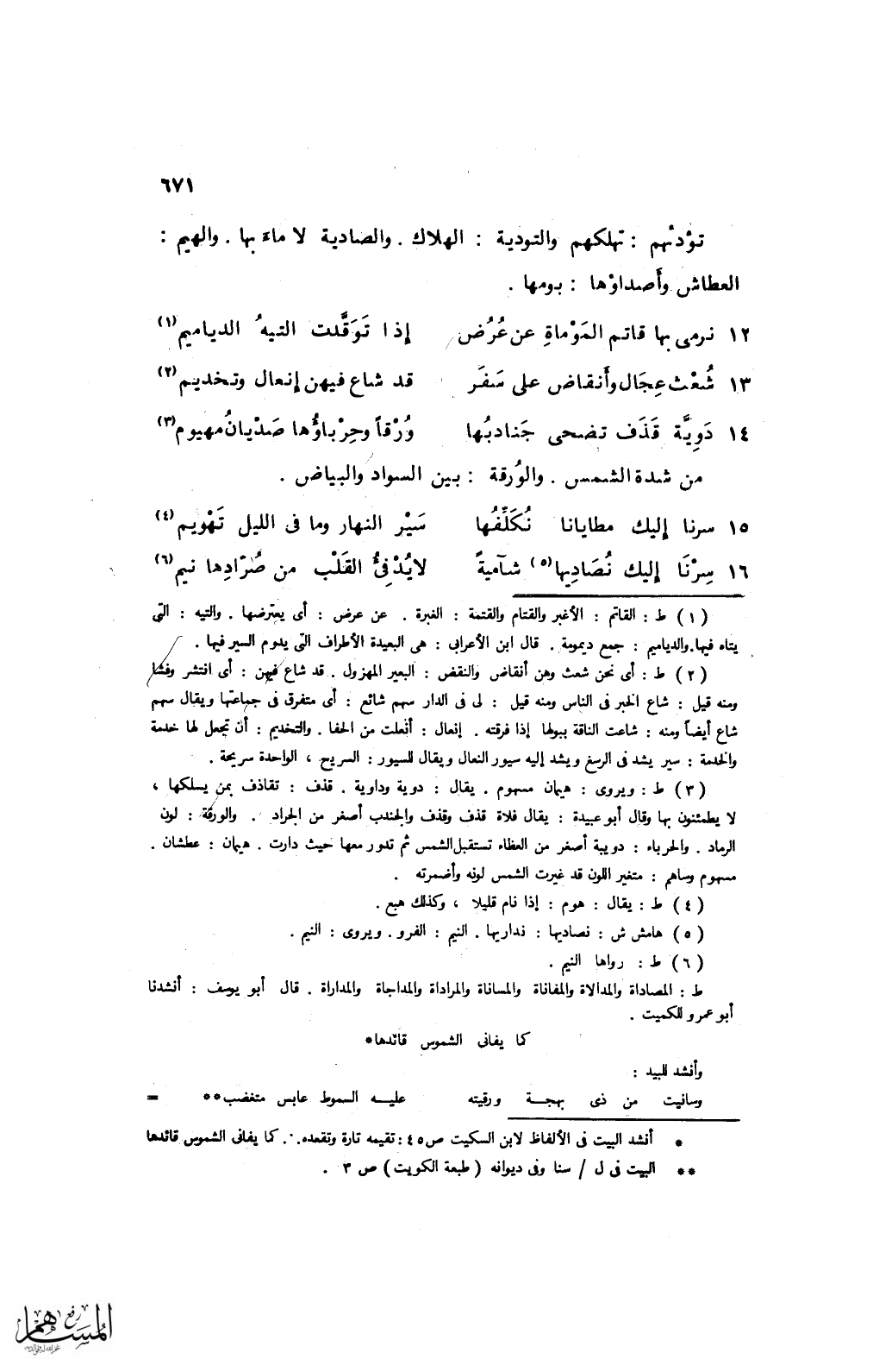 14 دوية قذف تضحى جنادبها ... ورقًا وحرباؤها صديان مهيوم