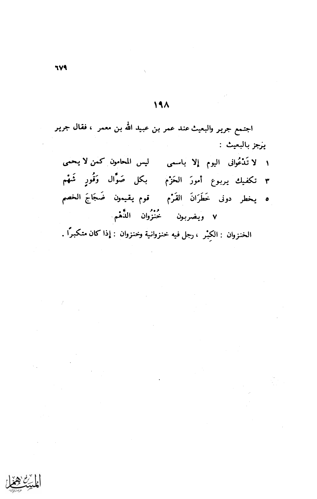 اجتمع جرير والبعيث عند عمر بن عبيد الله بن معمر، فقال جرير يزجر بالبعيث:
