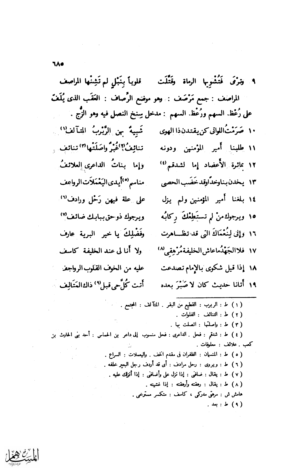 9 وترمى فتشويها الرماة وقتَّلت ... قلوبًا بنبلٍ لم تشنها المراصف