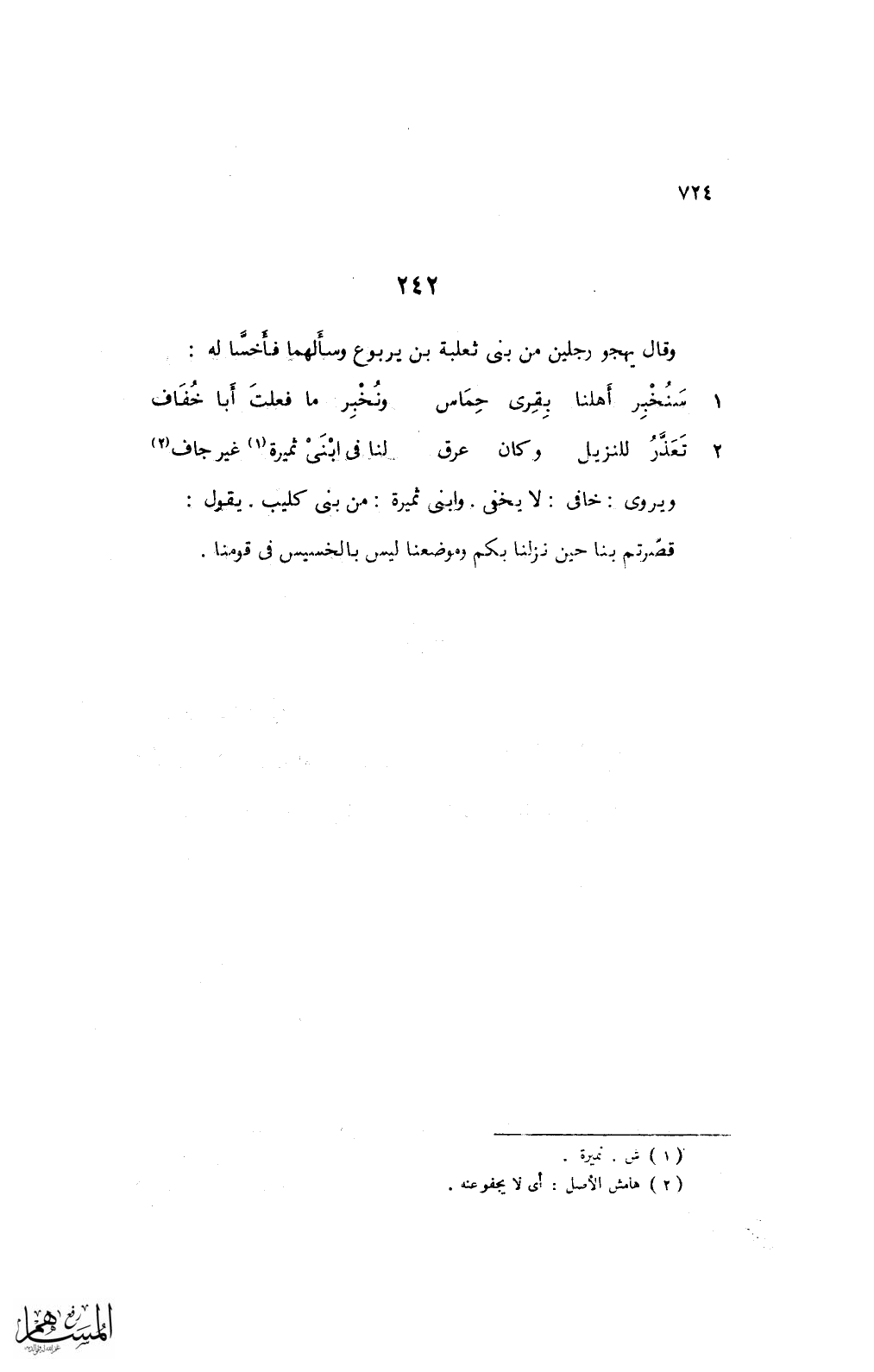 ويروى: خافى: لا يخفى. وابنى ثميرة: من بنى كليب. يقول: قصّرتم بنا حين نزلنا بكم وموضعنا ليس بالخسيس في قومنا.