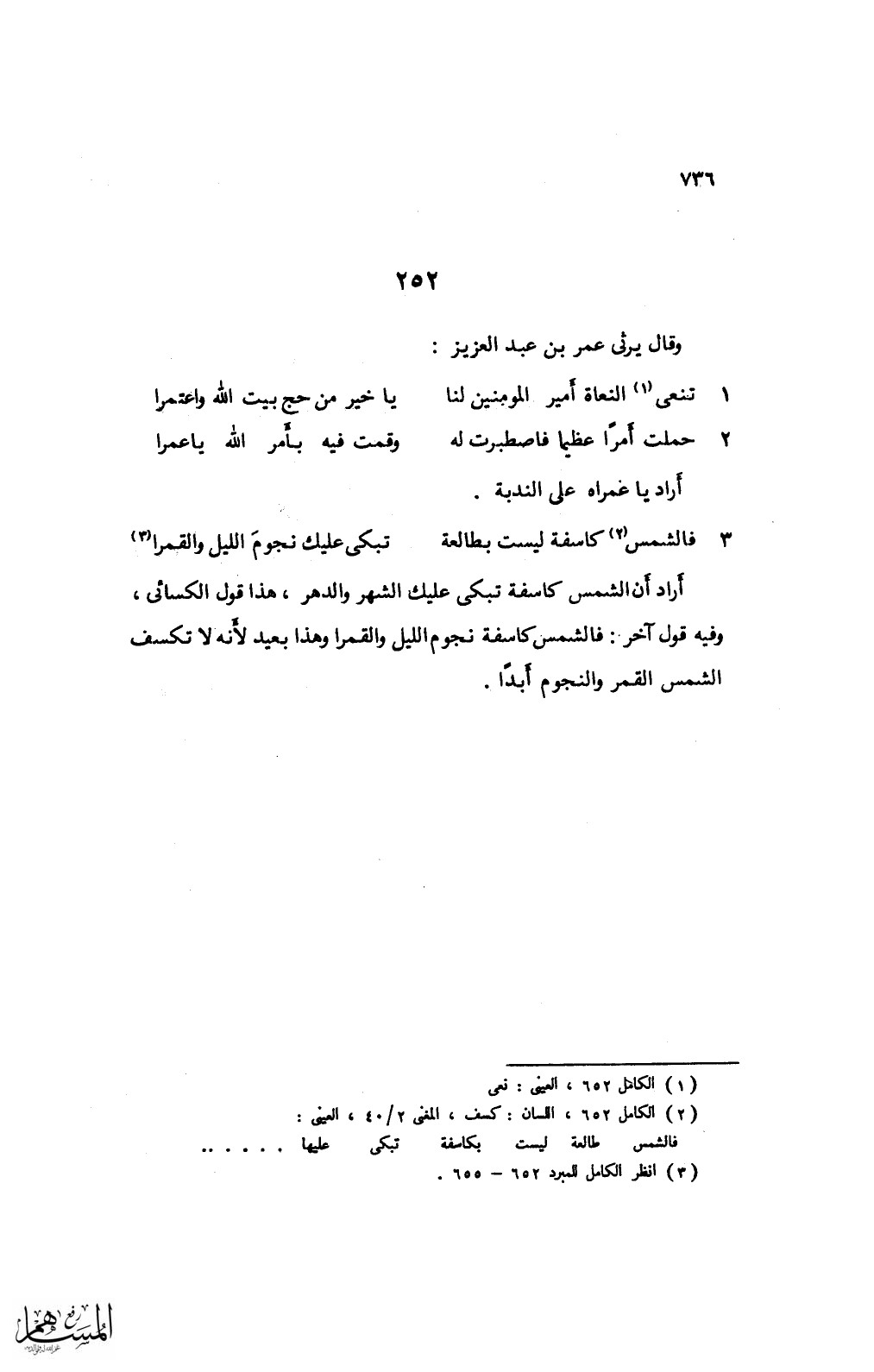 أراد أن الشمس كاسفة تبكي عليك الشهر والدهر، هذا قول الكسائي، وفيه قول آخر: فالشمس كاسفة نجوم الليل والقمرا وهذا بعيد لأنه لا تكسف الشمس القمر والنجوم أبدًا.