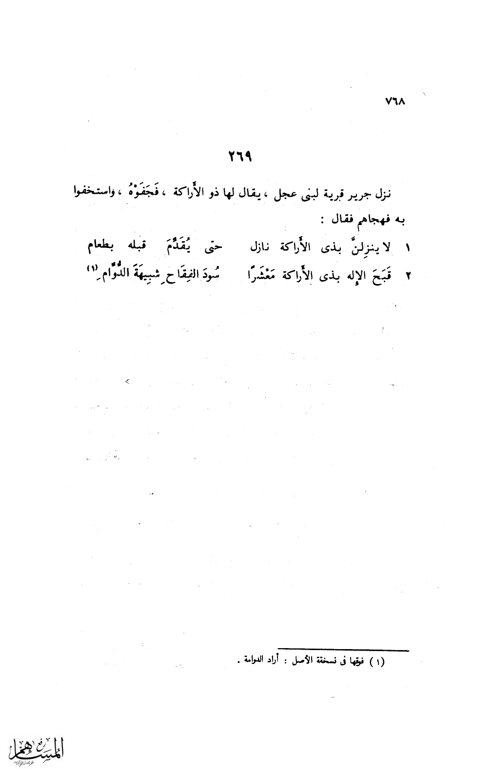 1 لا ينزلنَّ بذى الأراكة نازل ... حتى يقدِّم قبله بطعام