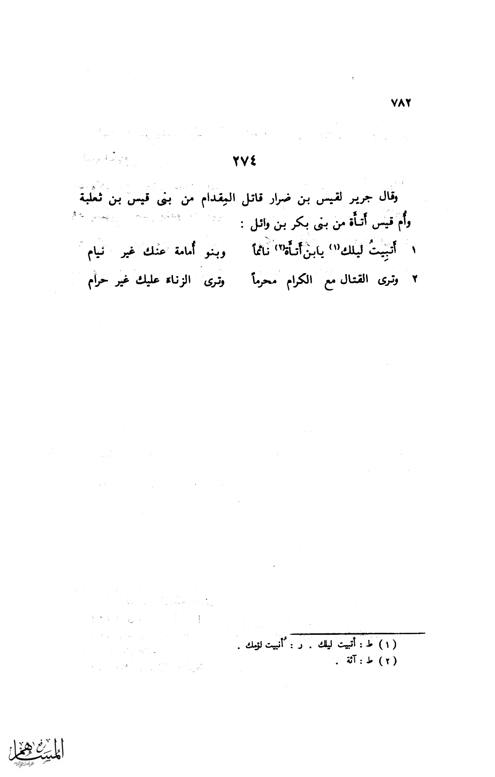 وقال جرير لقيس بن ضرار قاتل المقدام من بني قيس بن ثعلبة وأم قيس أتأه من بني بكر بن وائل: