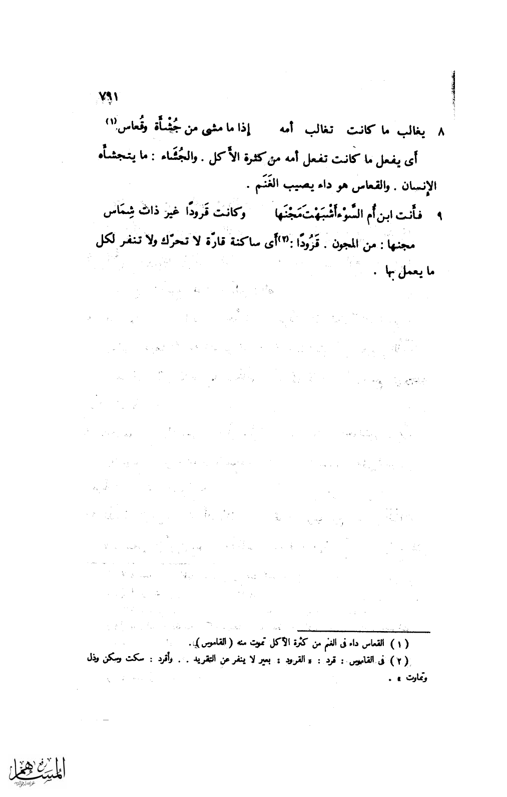 مجنها: من المجنون. قرودًا: أي ساكنة قارّة لا تحرّك ولا تنفر لكل ما يعمل بها.