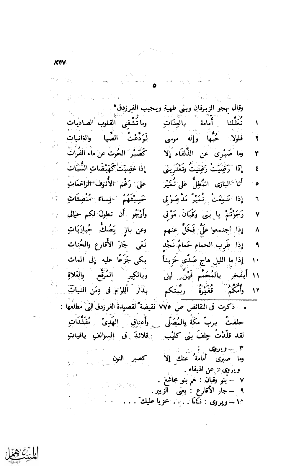 5 أنا البازى المطلُّ على نمير ... على رغم الأنوف الراغمات