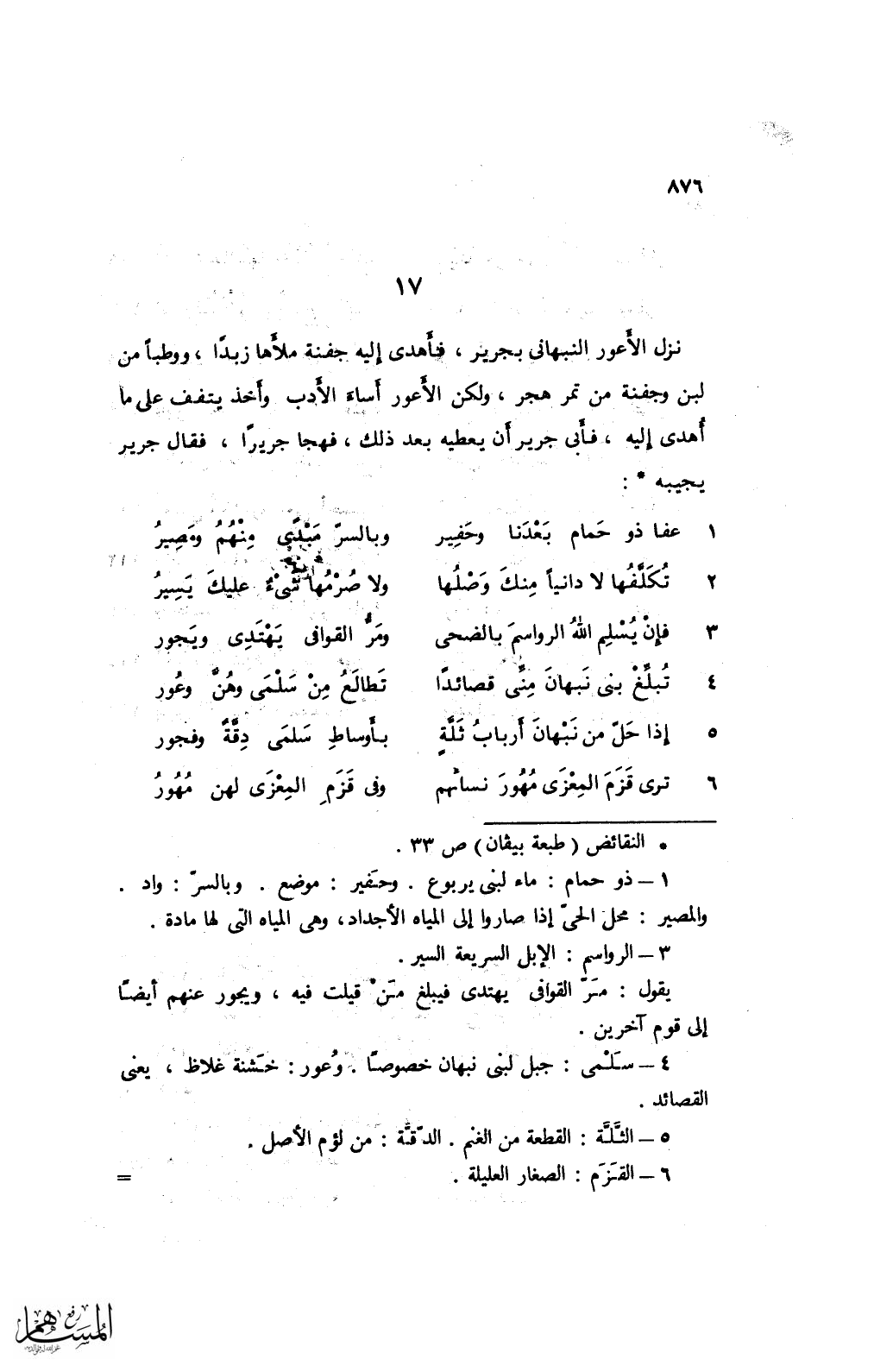 نزل الأعور النبهانى بجرير، فأهدى إليخ جفنة ملأها زبدًا، ووطبًا من لبن وجفنة من تمر هجر، ولكن الأعور أساء الأدب وأخذ يتفف على ما أهدى إليه، فأبى جرير أن يعطيه بعد ذلك، فهجا جريرًا، فقال جرير يجيبه*: