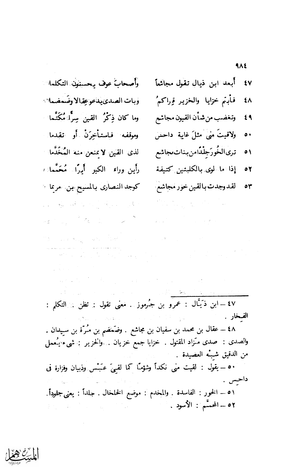 53 لقد وجدت بالقين خور مجاشع ... كوجد النصارى بالمسيح بن مريما