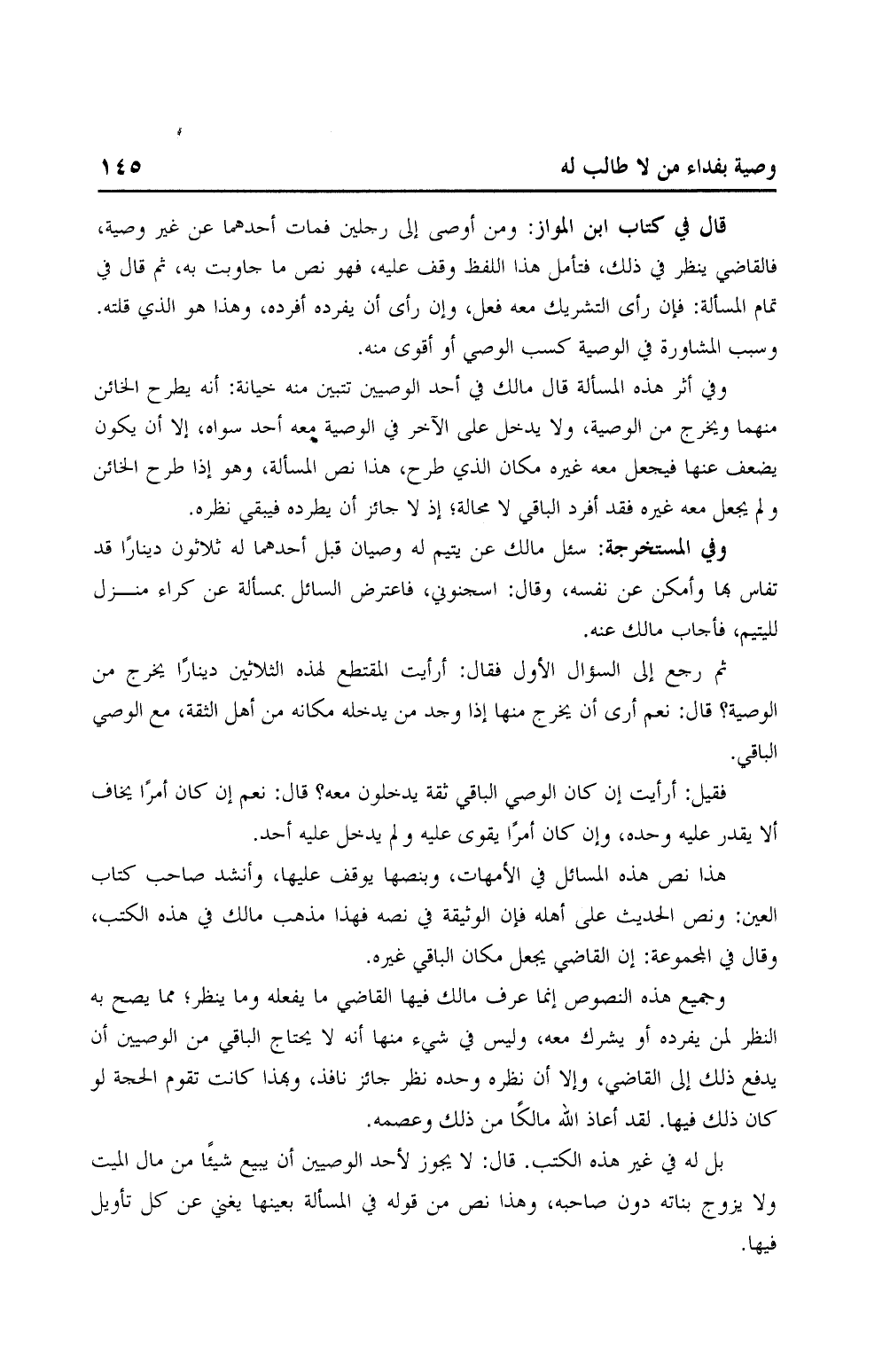 وجميع هذه النصوص إنما عرف مالك فيها القاضي ما يفعله وما ينظر؛ مما يصح به النظر لمن يفرده أو يشرك معه، وليس في شيء منها أنه لا يحتاج الباقي من الوصيين أن يدفع ذلك إلى القاضي، وإلا أن نظره وحده نظر جائز نافذ، وبهذا كانت تقوم الحجة لو كان ذلك فيها. لقد أعاذ الله مالكًا من ذلك وعصمه.