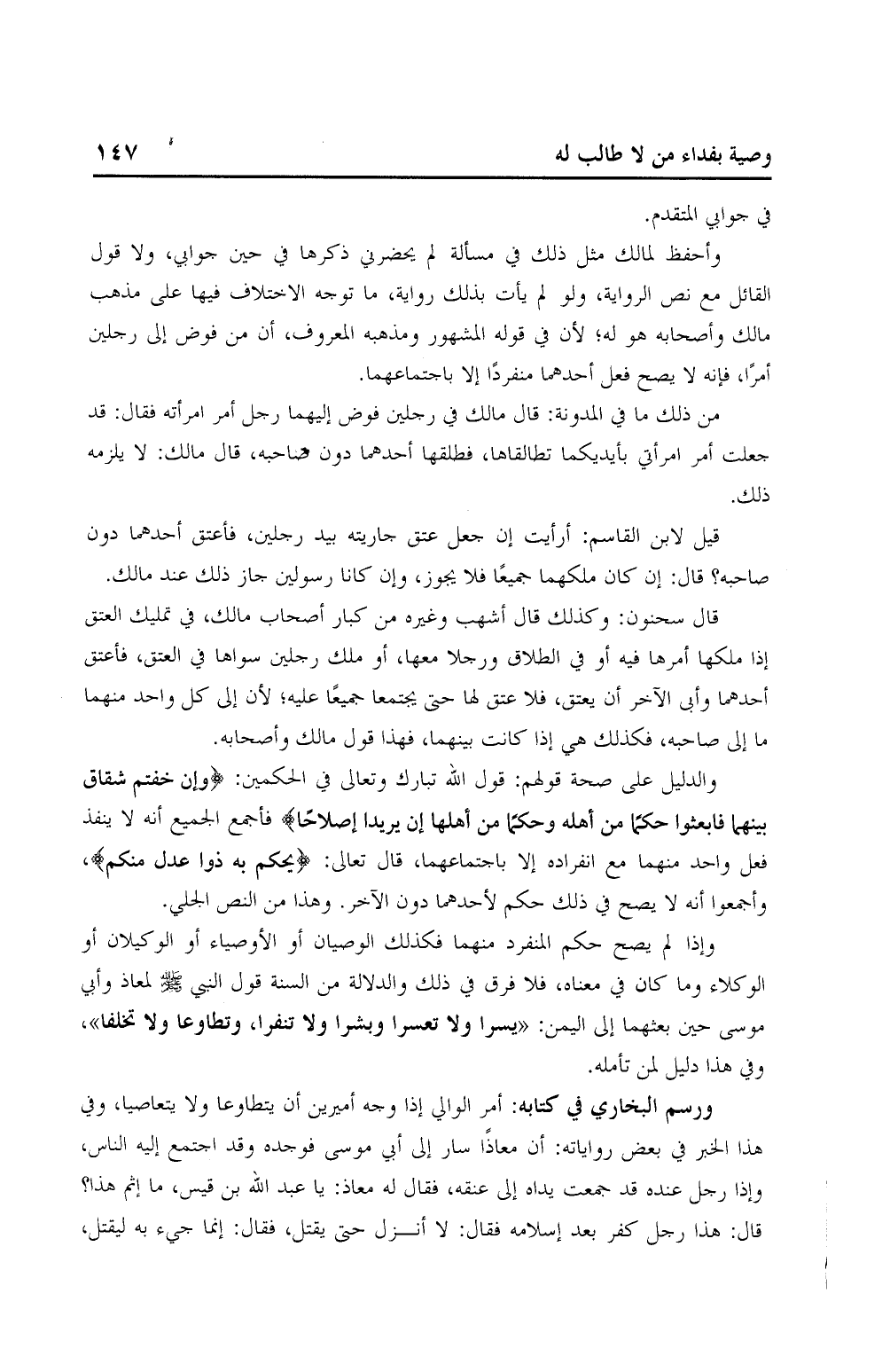 وأحفظ لمالك مثل ذلك في مسألة لم يحضرني ذكرها في حين جوابي، ولا قول القائل مع نص الرواية، ولو لم يأت بذلك رواية، ما توجه الاختلاف فيها على مذهب مالك وأصحابه هو له؛ لأن في قوله المشهور ومذهبه المعروف، أن من فوض إلى رجلين أمرًا، فإنه لا يصح فعل أحدهما منفردًا إلا باجتماعهما.