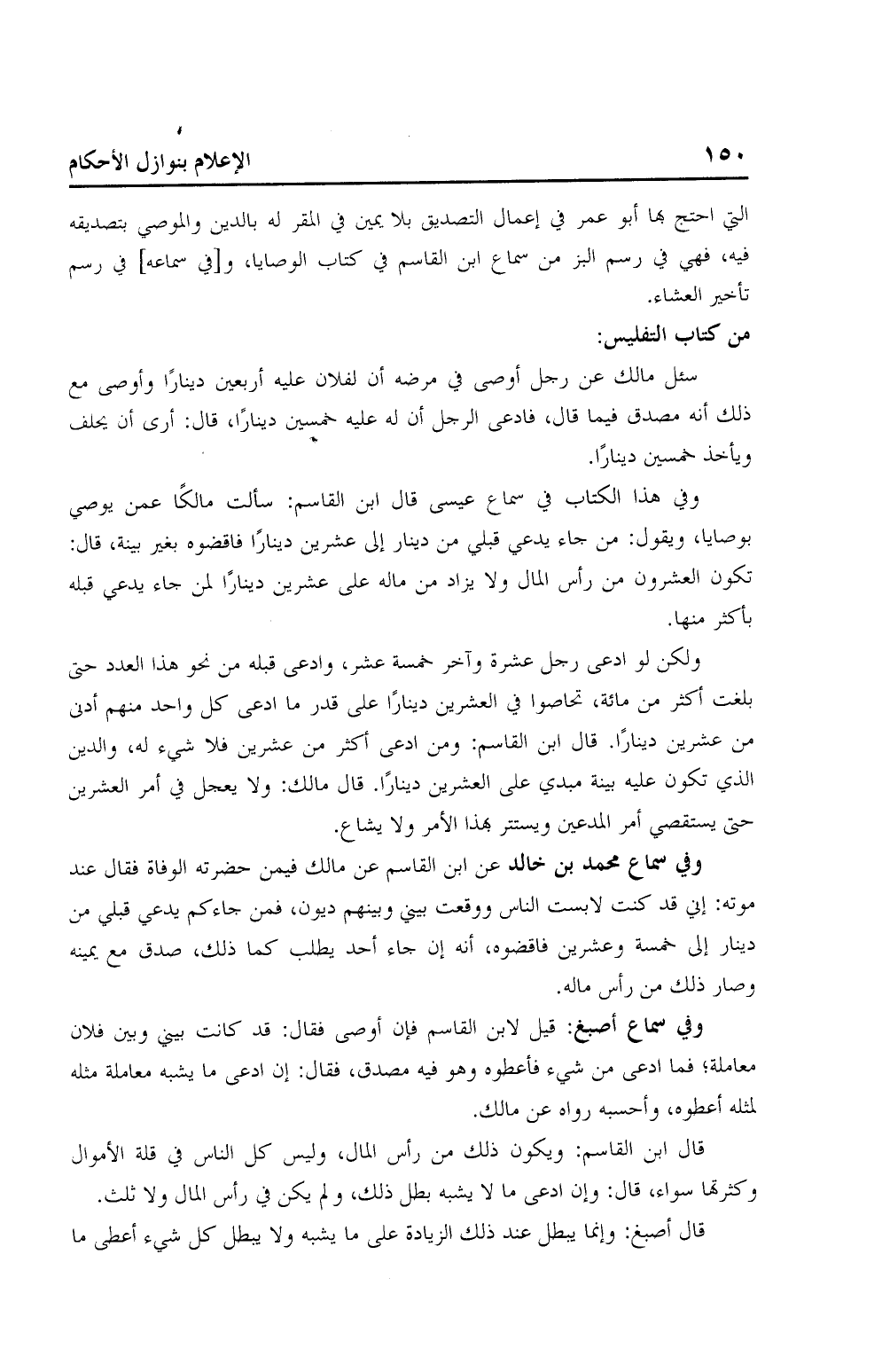 وفي هذا الكتاب في سماع عيسى قال ابن القاسم: سألت مالكًا عمن يوصي بوصايا، ويقول: من جاء يدعي قبلي من دينار إلى عشرين دينارًا فاقضوه بغير بينة، قال: تكون العشرون من رأس المال ولا يزاد من ماله على عشرين دينارًا لمن جاء يدعي قبله بأكثر منها.
