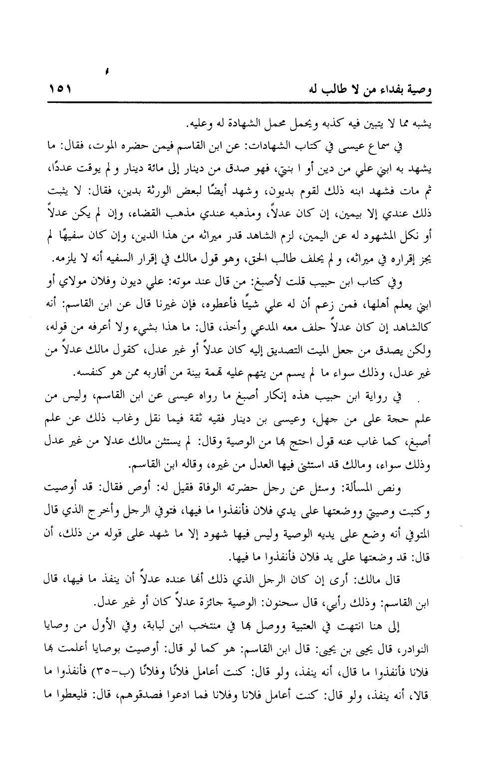 إلى هنا انتهت في العتبية ووصل بها في منتخب ابن لبابة، وفي الأول من وصايا النوادر، قال يحيى بن يحيى: قال ابن القاسم: هو كما لو قال: أوصيت بوصايا أعلمت بها فلانًا فأنفذوا ما قال، أنه ينفذ، ولو قال: كنت أعامل فلانًا وفلانًا (ب-35) فأنفذوا ما قالا، أنه نفذ، ولو قال: كنت أعامل فلانًا وفلانًا فما أدعو فصدقوهم، قال: فليعطوا ما