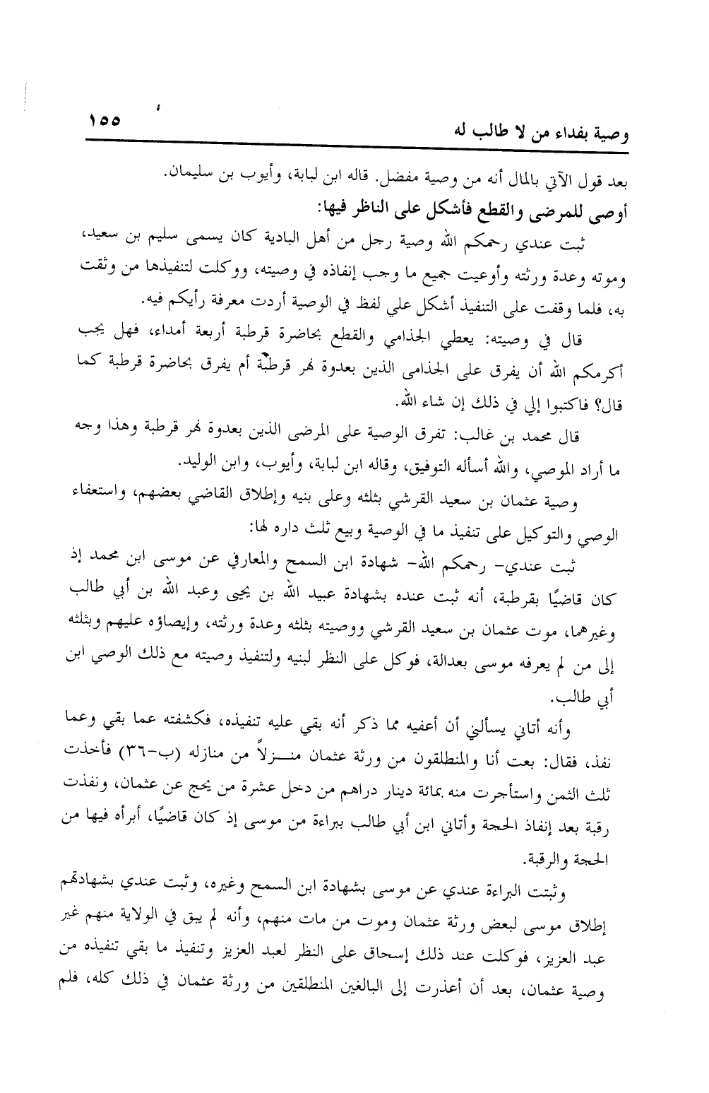 ثبت عندي - رحكم الله - شهادة ابن السمح والمعارفي عن موسى ابن محمد إذ كان قاضيًا بقرطبة، أنه ثبت عنده بشهادة عبيد الله بن يحيى وعبدالله بن أبي طالب وغيرهما، موت عثمان بن سعيد القرشي ووصيته بثلثه وعدة ورثته، وإيضاؤه عليهم وبثلثه إلى من لم يعرفه موسى بعدالة، فوكل على النظر لبنيه ولتنفيذ وصيته مع ذلك الوصي ابن أبي طالب.