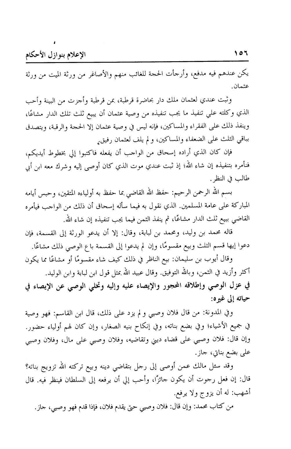 وثبت عندي لعثمان ملك دار بحاضرة قرطبة، بمن قرطبة وأجزت من البنية وأحب الذي وكلته علي تنفيذ ما يجب تنفيذه من وصية عثمان أن يبيع ثلث تلك الدار مشاعًا، وينفذ ذلك على الفقراء والمساكين، فإنه ليس في وصية عثمان إلا الحجة والرقبة، ويتصدق بباقي الثلث على الضعفاء والمساكين، ولم يلف لعثمان رفيق.