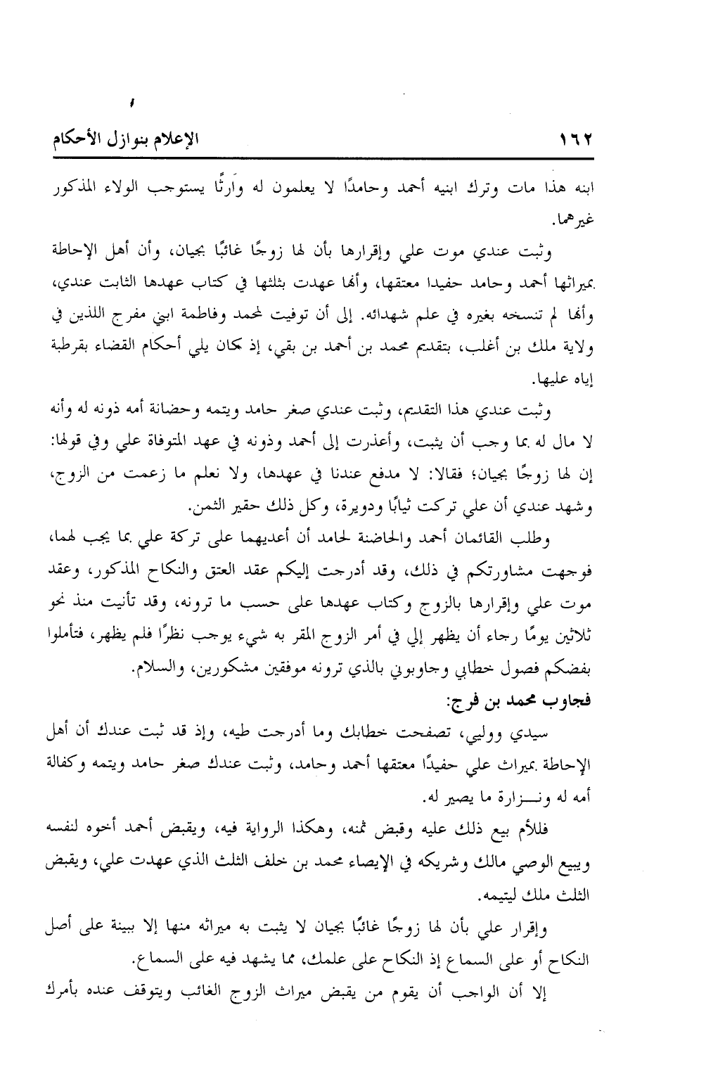 سيدي ووليي، تصفحت خطابك وما أدرجت طيه، وإذ قد ثبت عندك أن أهل الإحاطة بميراث علي حفيدًا معتقها أحمد وحامد، وثبت عندك صغر حامد ويتمه وكفالة أمه له ونزاره ما يصير له.