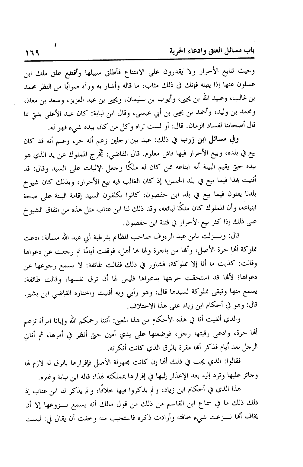 وفي مسائل ابن زرب في ذلك: عبد بين رجلين زعم أنه حر، وعلم أنه قد كان بيع في بلده، وبيع الأحرار فيها فاش معلوم. قال القاضي: يخرج المملوك عن يد الذي هو بيده حتى يقيم البينة أنه ابتاعه ممن كان له ملكًا وجعل الإثبات على السيد وقال: قد أفتيت بهذا فيما بيع في بلد الحسن؛ إذ كان الغالب فيه بيع الأحرار، وبذلك كان شيوخ بلدنا يفتون فيما بيع في بلد ابن حفصون، كانوا يكلفون السيد إقامة البينة على صحة ابتياعه، وأن المملوك كان ملكًا لبائعه، وقد ذلك لنا ابن عتاب مثل هذه من اتفاق الشيوخ على ذلك إذا كثر بيع الأحرار في فتنة ابن حفصون.