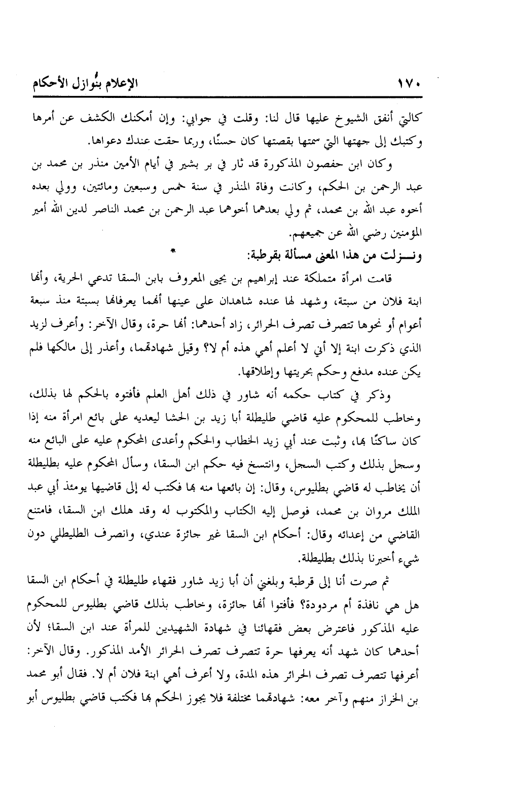 ثم صرت أنا إلى قرطبة وبلغني أن أبا زيد شاور فقهاء طليطلة في أحكام ابن السقا هل هي نافذة أم مردودة؟ فأفتوا أنها جايزة، وخاطب بذلك قاضي بطليوس للمحكوم عليه المذكور فاعترض بعض فقهائنا في شهادة الشهيدين للمرأة عند ابن السقا؛ لأن أحدهما كان شهد أنه يعرفها حرة تتصرف تصرف الحرائر الأمد المذكور. وقال الآخر: أعرفها تتصرف تصرف الحرائر هذه المدة، ولا أعرف أهي ابنة فلان أم لا. فقال أبومحمد بن الخزاز منهم وآخر معه: شهادتهما مختلفة فلا يجوز الحكم بها فكتب قاضي بطليوس