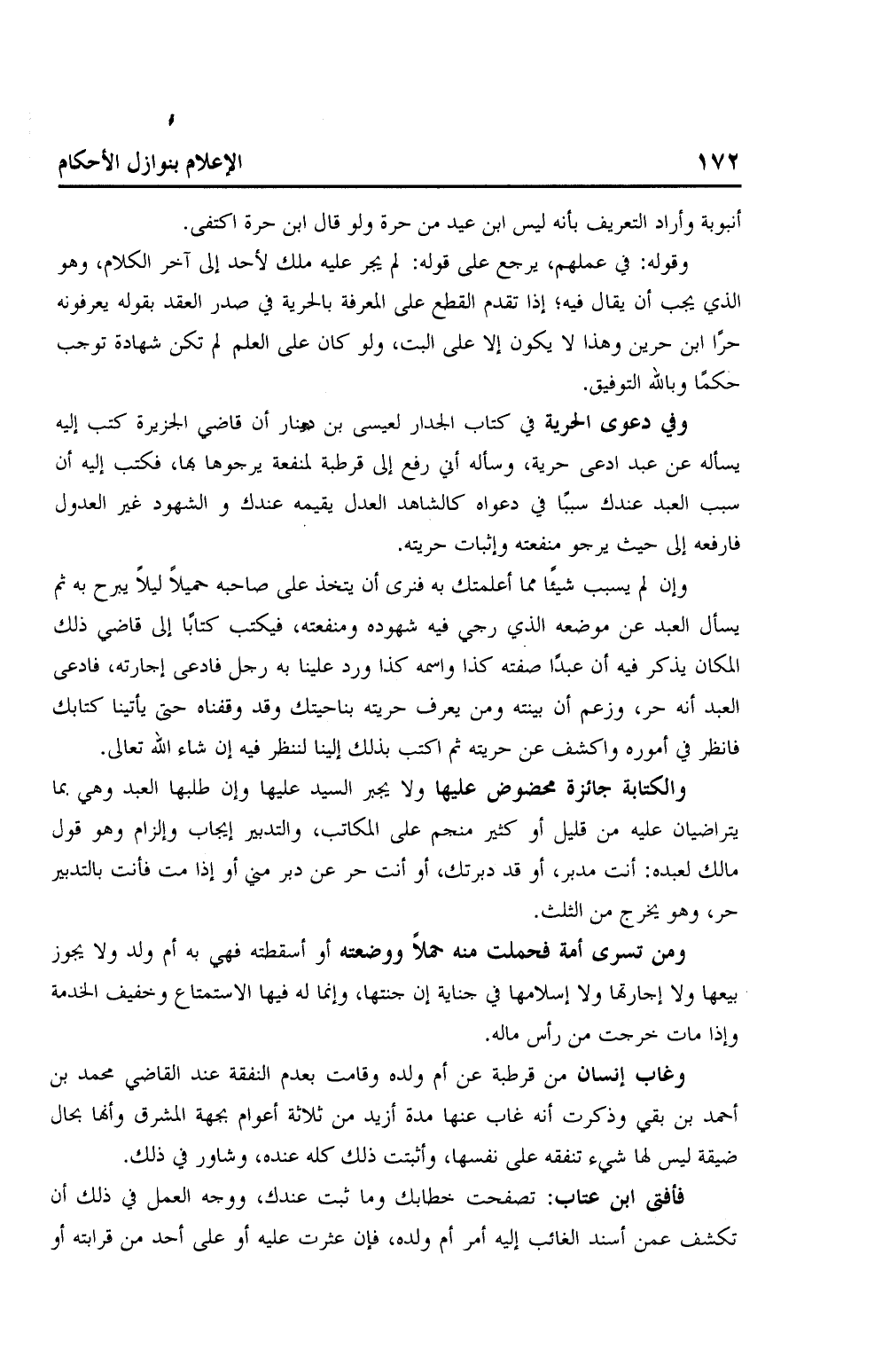 وفي دعوى الحرية في كتاب الجدار لعيسى بن دينار أن قاضي الجزيرة كتب إليه يسأله عن عبد ادعى حرية، وسأله أني رفع إلى قرطبة لمنفعة يرجوها بها، فكتب إليه أن سبب العبد عندك سببًا في دعواه كالشاهد العدل يقيمه عندك والشهود غير العدول فارفعه على حيث يرجو منفعته وإثبات حريته.