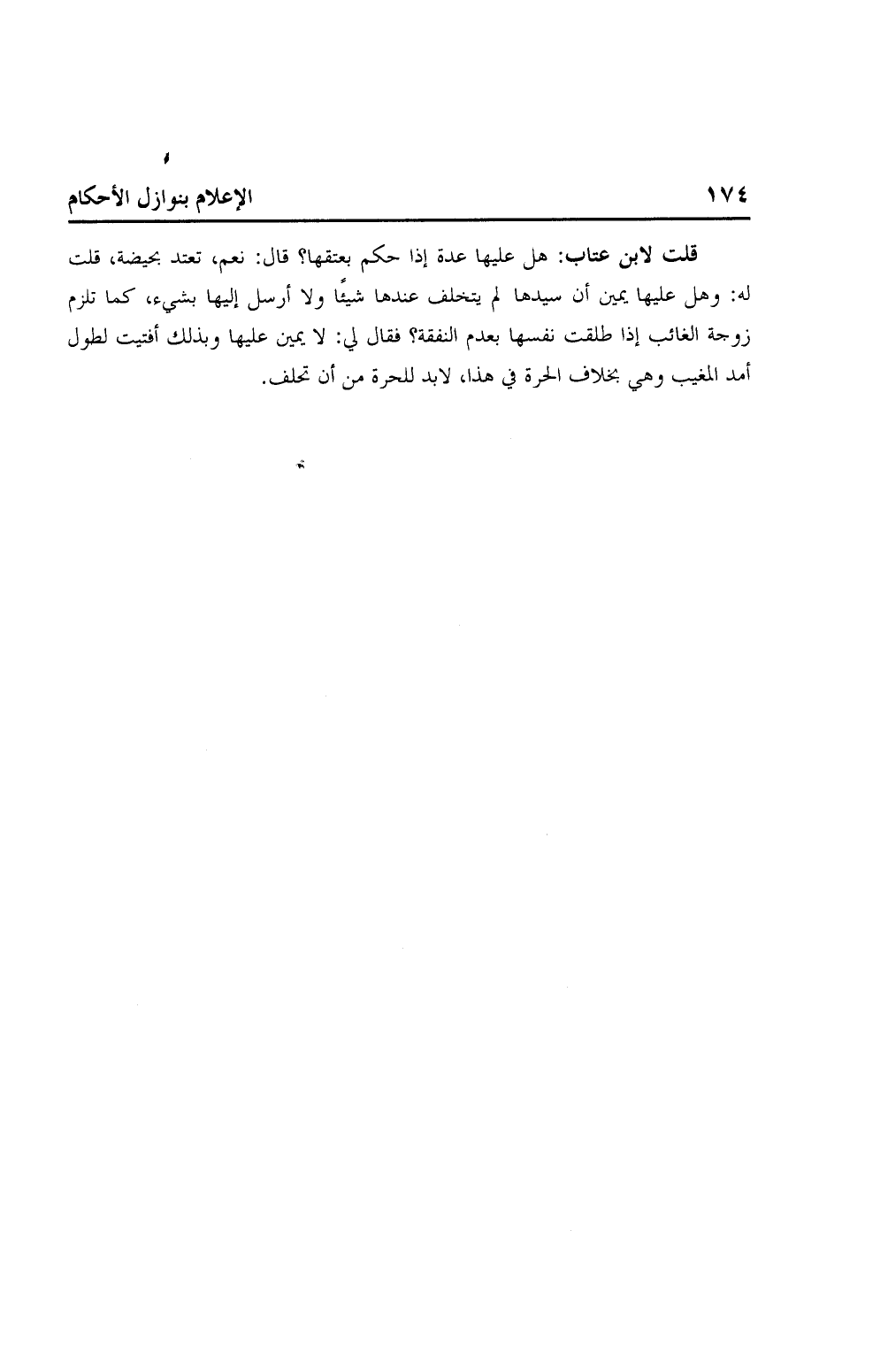 قلت لابن عتاب: هل عليها عدة إذا حكم بعتقها؟ قال: نعم، تعتد بحيضة، قلت له: وهل عليها يمين أن سيدها لم يتخلف عندها شيئًا ولا أرسل إليها بشيء، كما تلزم زوجة الغائب إذا طلقت نفسها بعدم النفقة؟ فقال لي: لا يمين عليها وبذلك أفتيت لطول أمد المغيب وهي لخلاف الحرة في هذا، لابد للحرة من أن تحلف.
