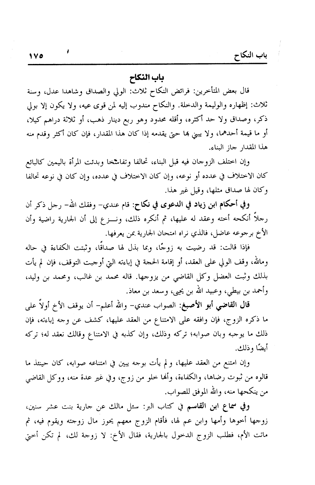 قال بعض المتأخرين: فرائض النكاح ثلاث: الولي والصداق وشاهدًا عدل، وسنة ثلاث: إظهاره والوليمة والدخلة. والنكاح مندوب إليه لمن قوى عليه، ولا يكون إلا بولي ذكر، وصداق ولا حد أكثره، وأقله محدود وهو ربع دينار ذهب، أو ثلاثة دراهم كيلا، أو ما قيمة أحدهما، ولا يبني بها حتى يقدمه إذا كان هذا المقدار، فإن كان أكثر وقدم منه هذا المقدار جاز البناء.