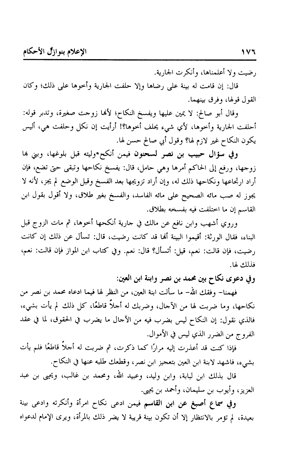 فهمنا - وفقك الله - ما سألت ابنة العين، من النظر لها فيما ادعاه محمد بن نصر من نكاحها، وما ضربت لها من الآجال، وضربك له أجلاً قاطعًا، كل ذلك لم يأت بشيء، فالذي نقول: إن النكاح ليس بضرب فيه من الآجال ما يضرب في الحقوق، لما في عقد الفروج من الضرر الذي ليس في الأموال.