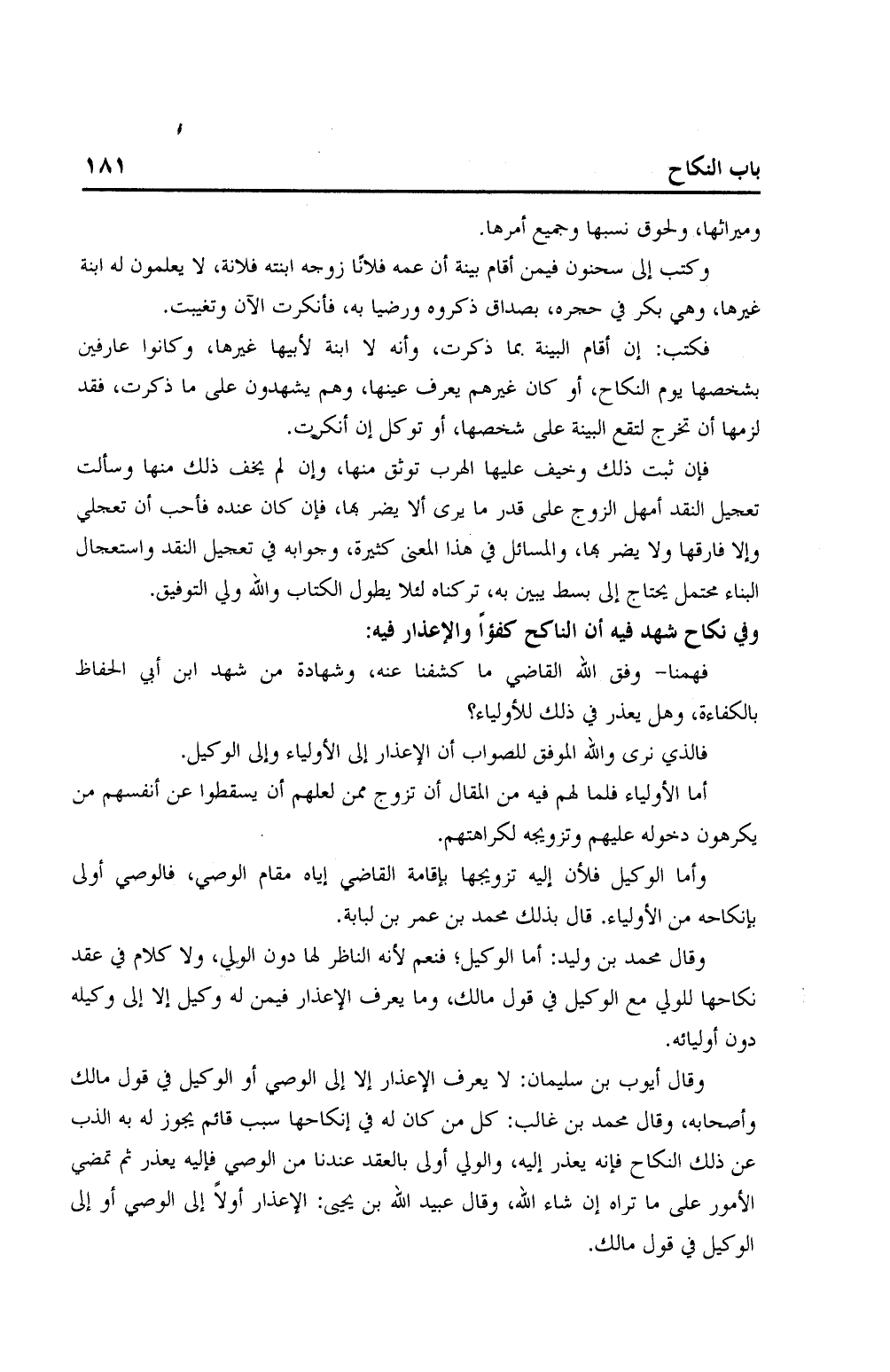 وقال أيوب بن سليمان: لا يعرف الإعذار إلا إلى الوصي أو الوكيل في قول مالك وأصحابه، وقال محمد بن غالب: كل من كان له في إنكاحها سبب قائم يجوز له به الذب عن ذلك النكاح فإنه يعذر إليه، والولي أولى بالعقد عندنا من الوصي فإليه يعذر ثم تمضي الأمور على ما تراه إن شاء الله، وقال عبيد الله بن يحيى: الإعذار أولاً إلى الوصي أو إلى الوكيل في قول مالك.