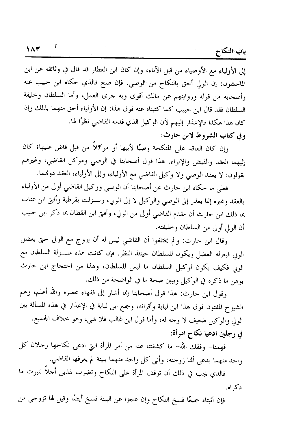 وقال ابن حارث: ولم يختلفوا أن القاضي ليس له أن يزوج مع الولي حتى يعضل الولي فيعزله العضل ويكون للسلطان حينئذ النظر. فإن كانت هذه منزلة السلطان مع الولي فكيف يكون لوكيل السلطان ما ليس للسلطان، وهذا من احتجاج ابن حارث يوهن ما ذكره في الوكيل ويبين صحة ما في الواضحة من ذلك.
