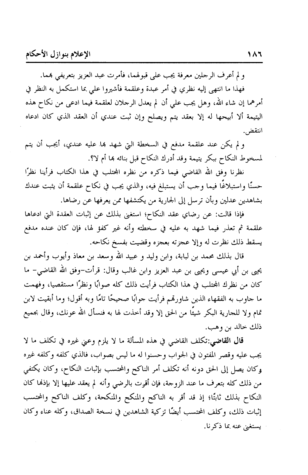 نظرنا وفق الله القاضي فيما ذكره من نظره المجتلب في هذا الكتاب فرأينا نظرًا حسنًا واستبلاغًا فيما وجب أن يستبلغ فيه، والذي يجب في نكاح علقمة أن يثبت عندك بشاهدين عدلين وبأن ترسل إلى الجارية من يكتشفها ممن يعرفه عن رضاها.