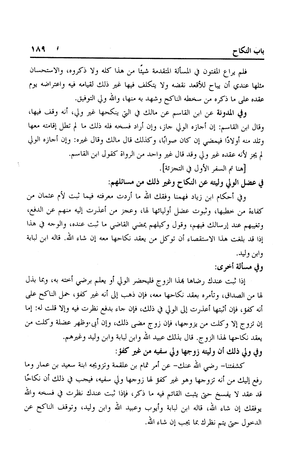 كشفتنا - رضي الله عنك - عن أمر تمام بن علقمة وتزويجه ابنة سعيد بن عمار وما رفع إليك من أنه تزوجها وهو غير كفؤ لها زوجها ولي سفيه، فيجب في ذلك أن نكاحًا قد عقد لا يفسخ حتى يثبت القائم فيه ما ذكر، فإذا ثبت عندك نظرت في فسخه والله يوفقك إن شاء الله، قاله ابن لبابة وأيوب وعبيد الله وابن وليد، وتوقف الناكح عن الدخول حتى يتم نظرك بما يجب إن شاء الله.