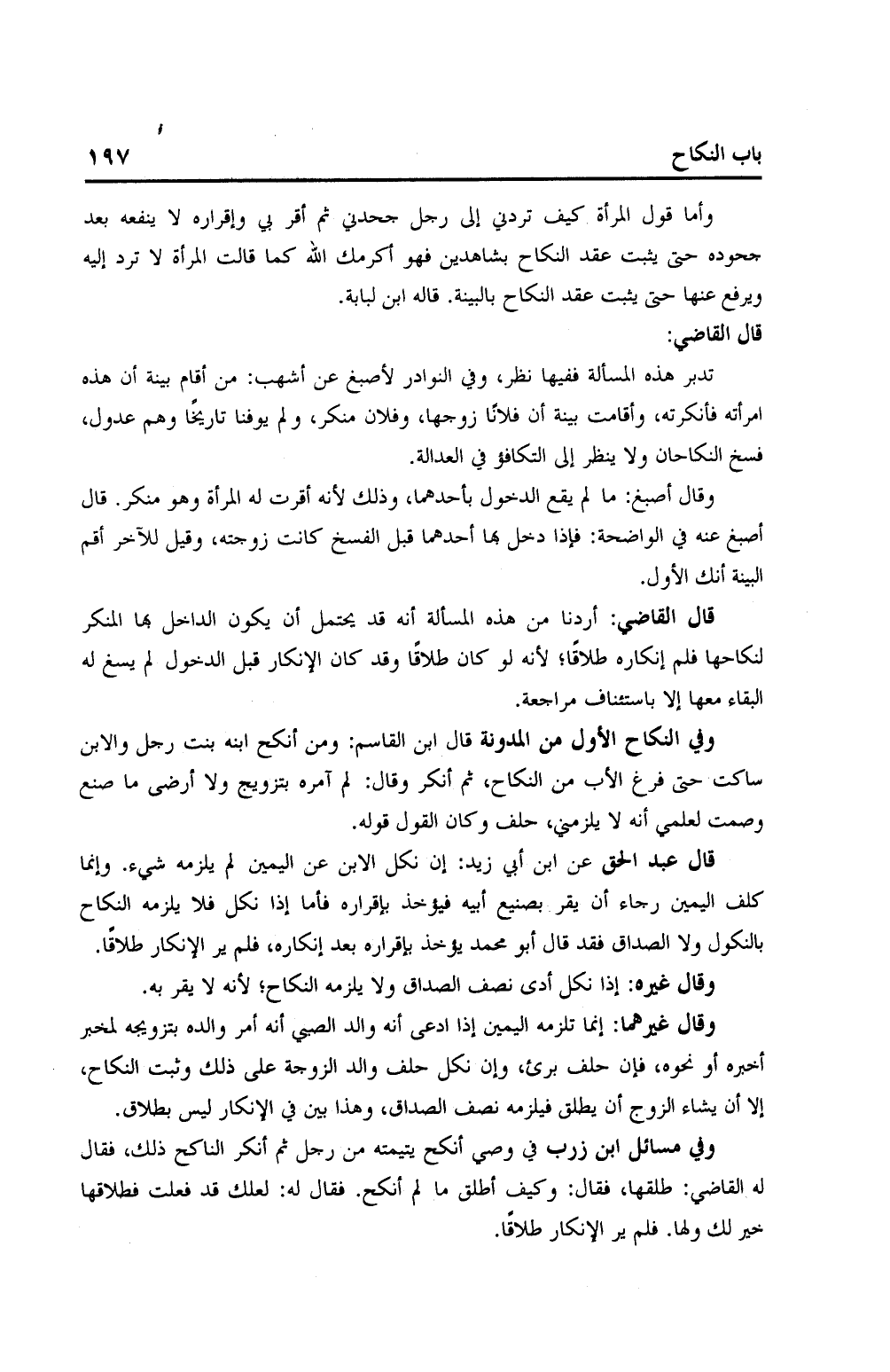قال عبدالحق: عن ابن أبي زيد: إن نكل الابن عن اليمين لم يلزمه شيء. وإنما كلف اليمين رجاء أن يقر بصنيع أبيه فيؤخذ بإقراره بعد إنكاره، فلم ير الإنكار طلاقًا.