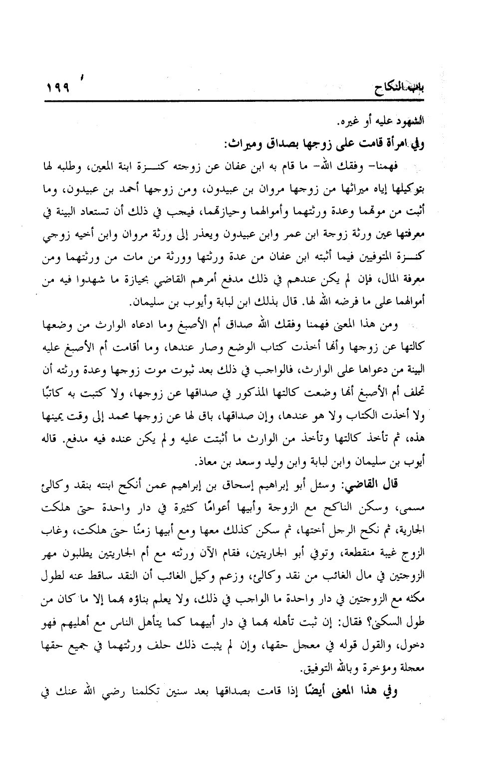 فهمنا - وفقك الله - ما قام به ابن عفان عن زوجته كنزة ابنة المعين، وطلبه لها بتوكيلها إياه ميراثها من زوجها مروان بن عبيدون، ومن زوجها أحمد بن عبيدون، وما أثبت من موتهما وعدة ورثتهما وأموالهما وحيازتهما، فيجب في ذلك أن تستعاد البينة في معرفتها عين ورثة زوجة ابن عمر وابن عبيدون ويعذر إلى ورثة من مات من ورثتهما ومن معرفة المال، فإن لم يكن عندهم في ذلك مدفع أمرهم القاضي بحيازة ما شهدوا في من أموالهما على ما فرضه الله لها. قال بذلك ابن لبابة وأيوب بن سليمان.