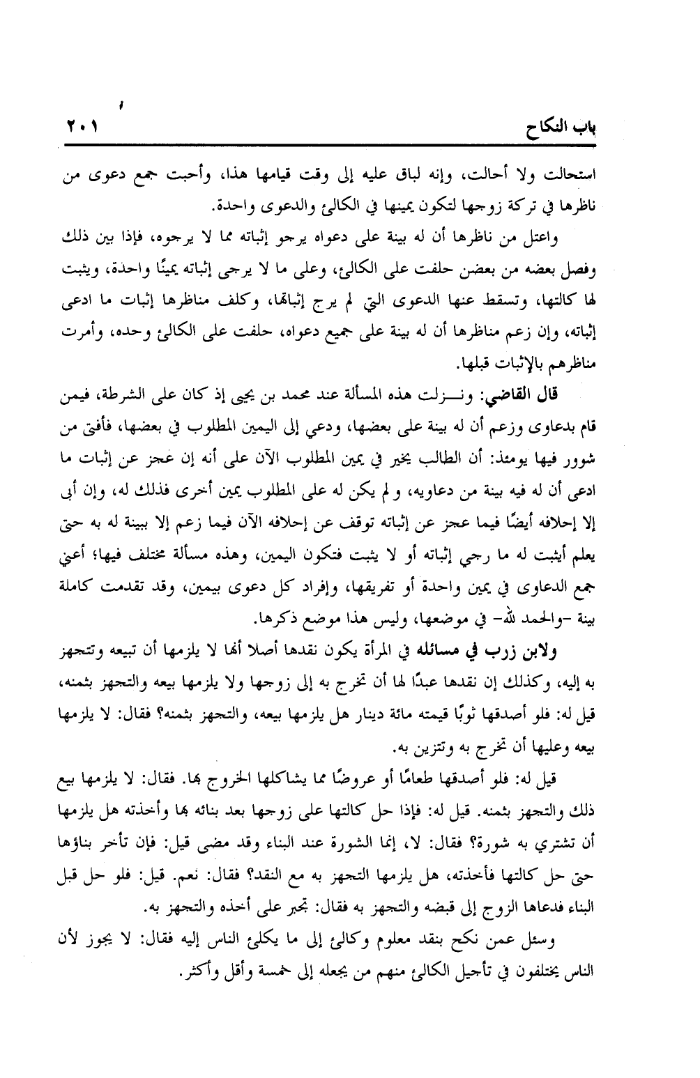 واعتل من ناظرها أن له بينة على دعواه يرجو إثباته مما لا يرجوه، فإذا بين ذلك وفصل بعضه من بعضن حلفت على الكالئ، وعلى ما لا يرجى إثباته يمنًا واحدة، ويثبت لها كالتها، وتسقط عنها الدعوى التي لم يرج إثباتها، وكلف مناظرها إثبات ما ادعى إثباته، وإن زعم مناظرها أن له بينة على جميع دعواه، حلفت على الكالئ وحده، وأمرت مناظرهم بالإثبات قبلها.