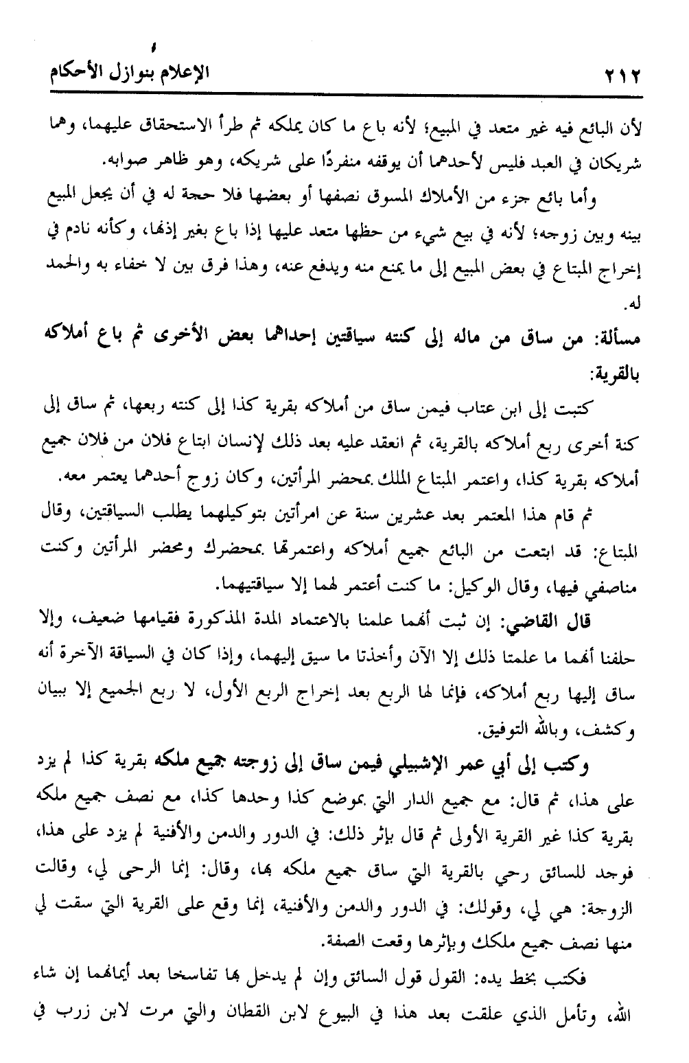 وكتب إلى أبي عمر الإشبيلي فيمن ساق إلى زوجته جميع ملكه بقرية كذا لم يزد على هذا، ثم قال: مع جميع الدار التي بموضع كذا وحدها كذا، مع نصف جميع ملكه بقرية كذا غير القرية الأولى ثم قال بإثر ذلك: في الدور والدمن والأفنية لم يزد على هذا، فوجد للسائق رحي بالقرية التي ساق جميع ملكه بها، وقال: إنما الرحى لي، وقالت الزوجة: هي لي، وقولك: في الدور والدمن والأفنية، إنما وقع على القرية التي سقت لي منها نصف جميع ملكك وبإثرها وقعت الصفة.