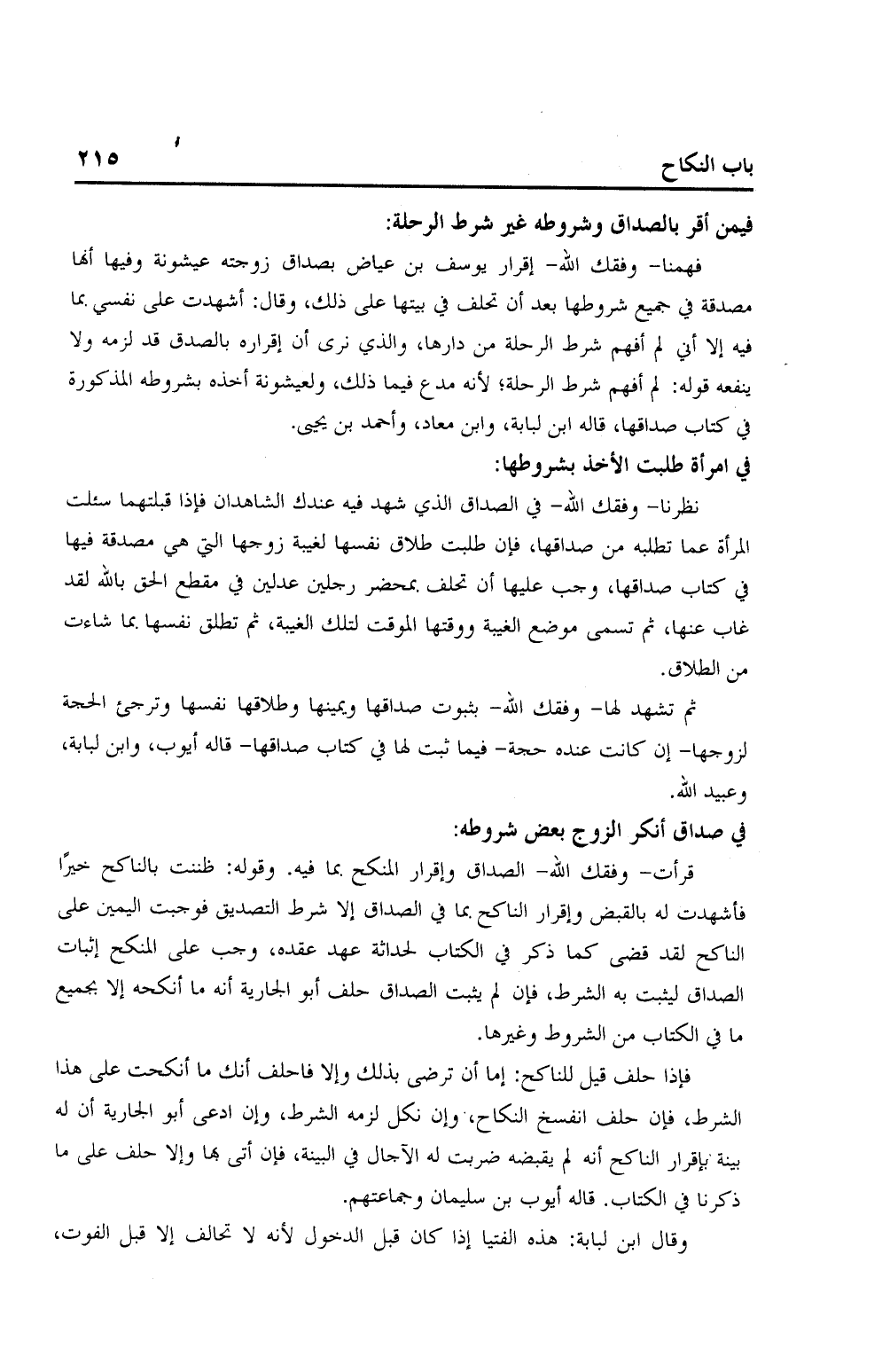 فهمنا- وفقك الله- إقرار يوسف بن عياض بصداق زوجته عيشونة وفيها أنها مصدقة في جميع شروطها بعد أن تحلف في بيتها على ذلك، وقال: أشهدت على نفسي بما فيه إلا أني لم أفهم شرط الرحلة من دارها، والذي نرى أن إقراره بالصدق قد لزمه ولا ينفعه قوله: لم أفهم شرط الرحلة؛ لأنه مدع فيما ذلك، ولعيشونة أخذه بشروطه المذكورة في كتاب صداقها، قاله ابن لبابة، وابن معاذ، وأحمد بن يحيى.