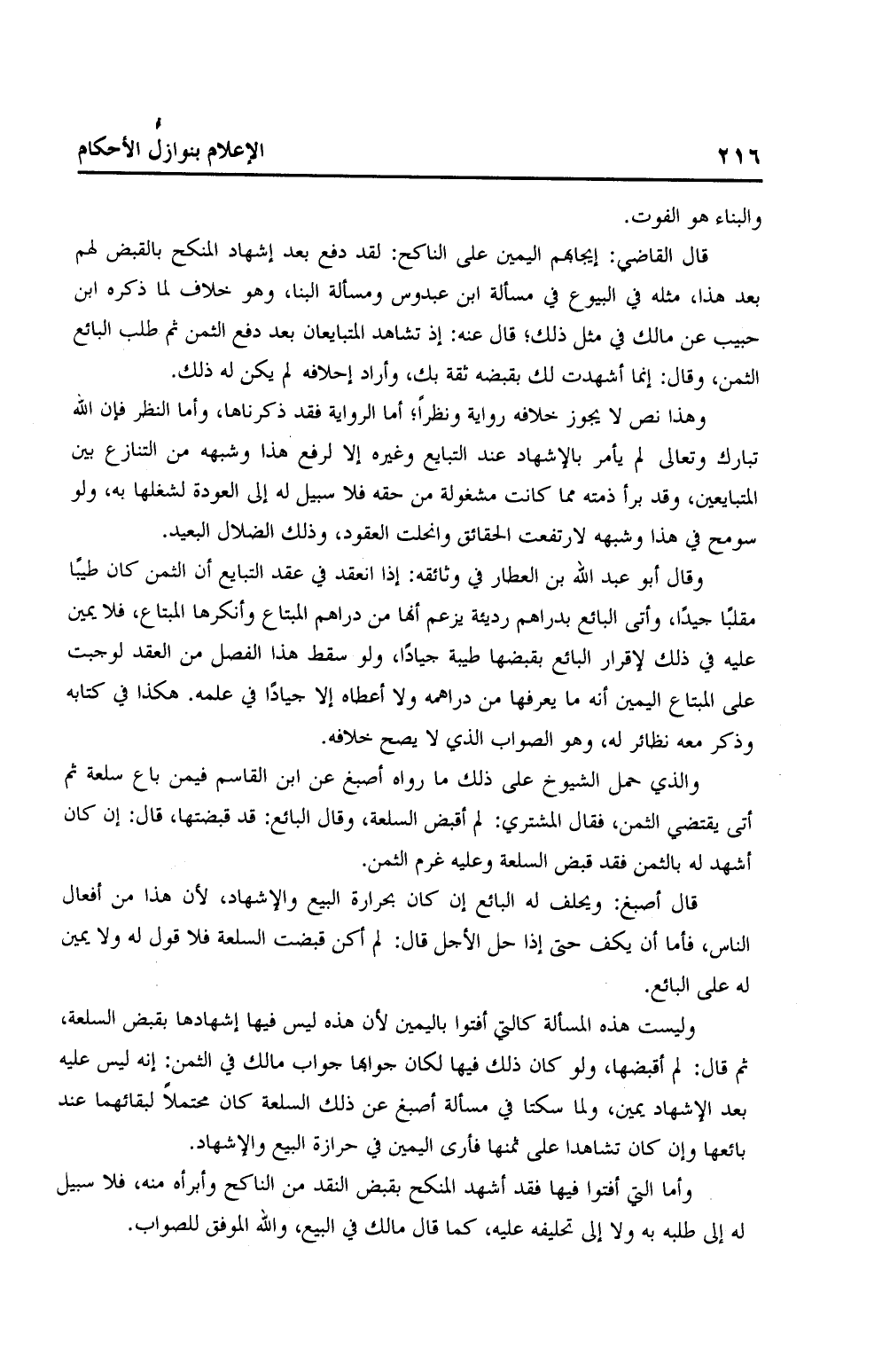 وهذا نص لا يجوز خلافه رواية ونظرًا؛ أما الرواية فقد ذكرناها، وأما النظر فإن الله تبارك وتعالى لم يأمر بالإشهاد عند التبايع وغيره إلا لرفع هذا وشبهه من التنازع بين المتبايعين، وقد برأ ذمته مما كانت مشغولة من حقه فلا بسبيل له إلى العودة لشغلها به، ولو سومح في هذا وشبهه لارتفعت الحقائق وانحلت العقود، وذلك الضلال البعيد.