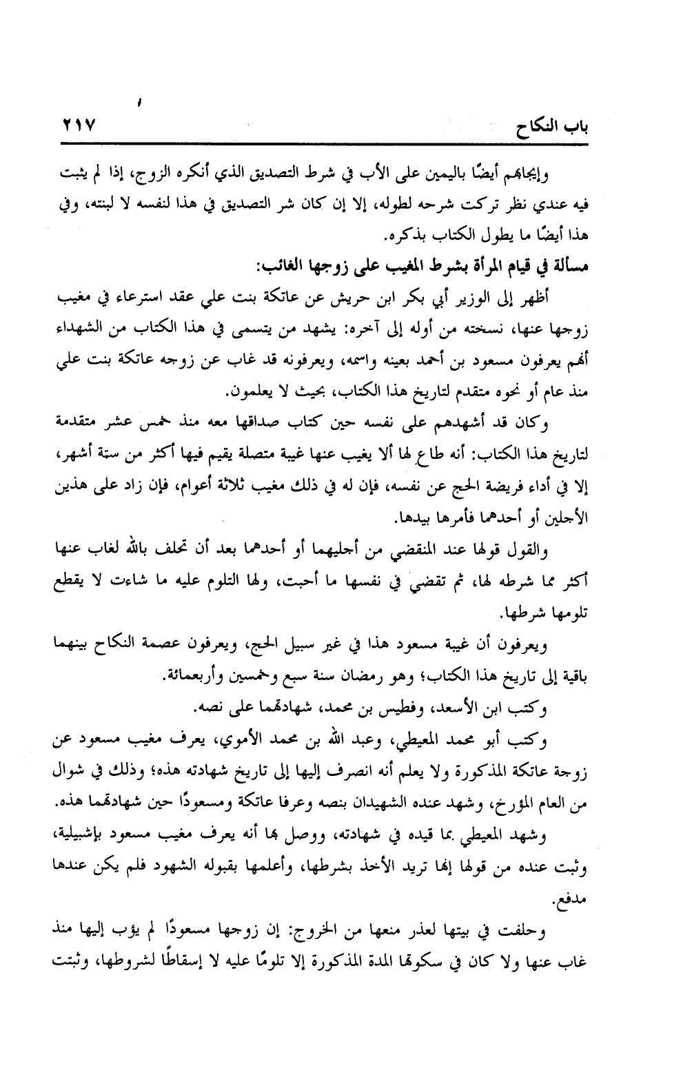 وكان قد أشهدهم على نفسه حين كتاب صداقها معه منذ خمس عشر متقدمة لتاريخ هذا الكتاب: أنه طاع لها ألا يغيب عنها غيبة متصلة يقيم فيها أكثر من ستة أشهر، إلا في أداء فريضة الحج عن نفسه، فإن له في ذلك مغيب ثلاثة أعوام، فإن زاد على هذين الأجلين أو أحدهما فأمرها بيدها.