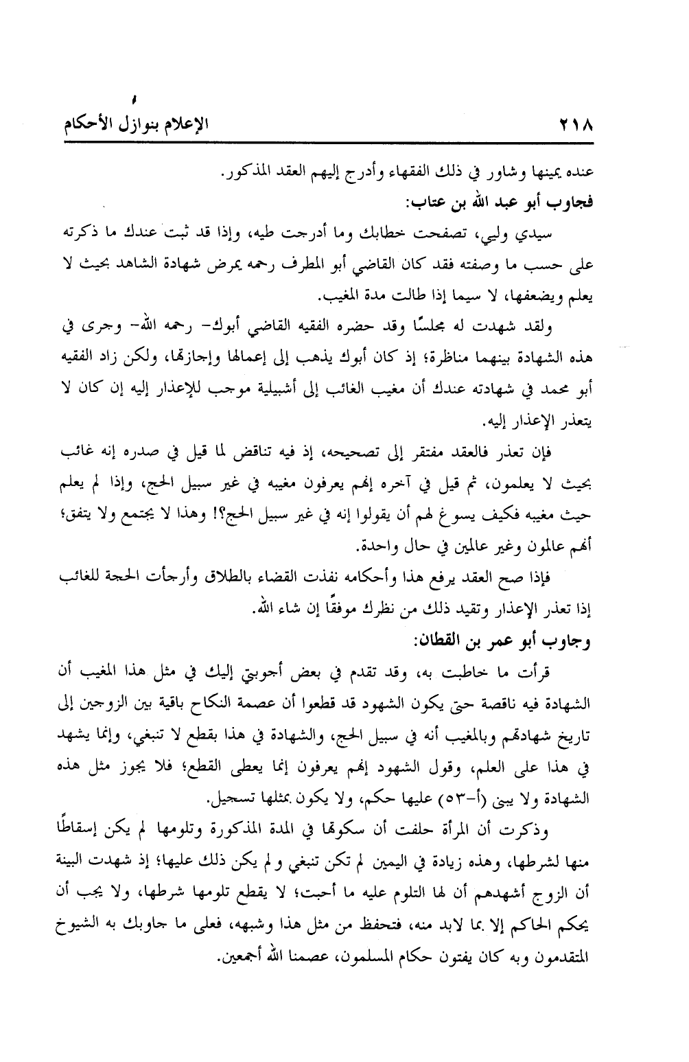 سيدي وليي، تصفحت خطابك وما أدرجت طيه، وإذا قد ثبت عندك ما ذكرته على حسب ما وصفته فقد كان القاضي أبو المطرف رحمه يمرض شهادة الشاهد بحيث لا يعلم ويضعفها، لاسيما إذا طالت مدة المغيب.
