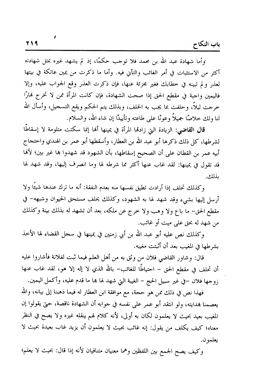 وأما شهادة عبد الله بن محمد فلا توجب حكمًا، إذ لم يشهد غيره بمثل شهادته أكثر من الاستثبات في أمر الغائب والتأني فيه. وأما ما ذكرت من يمين عاتكة في بيتها لعذر ولم تبينه في خطابك فغير مجزئة عنها، فإن ذكرت العذر وقع الجواب عليه، وإلا فاليمين واجبة في مقطع الحق إذا صحت الشهادة، فإن كانت المرأة ممن لا تخرج نهارًا خرجت ليلاً، وحلفت بما يجب به الحلف، وبذلك يتم الحكم ويقع التسجيل، وأسأل الله لنا ولك خلاصًا جميلاً وعونًا على طاعته وتأييدًا إن شاء الله، والسلام.