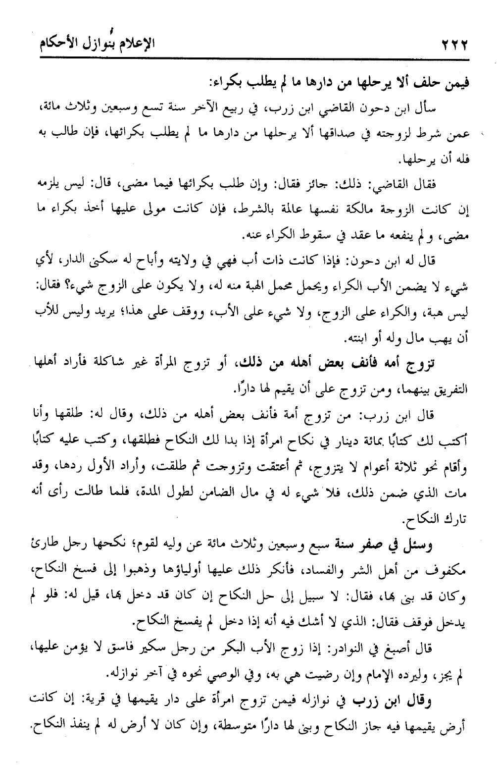سأل ابن دحون القاضي ابن زرب، في ربيع الآخر سنة تسع وسبعين وثلاث مائة، عمن شرط لزوجته في صداقها ألا يرحلها من دارها ما لم يطلب بكرائها، فإن طالب به فله أن يرحلها.