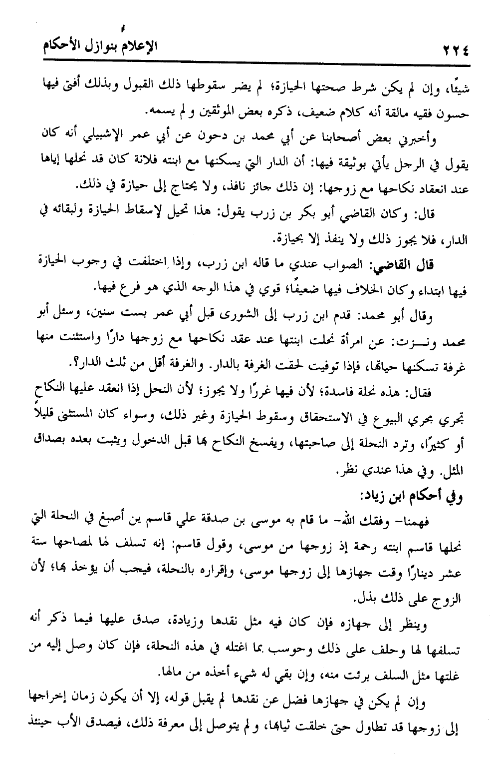 وقال أبو محمد: قدم ابن زرب إلى الشورى قبل أبي عمر بست سنين، وسئل أبو محمد ونزت: عن امرأة نحلت ابنتها عند عقد نكاحها مع زوجها دارًا واستثنت منها غرفة تسكنها حياتها، فإذا توفيت لحقت الغرفة بالدار. والغرفة أقل من ثلث الدار؟.