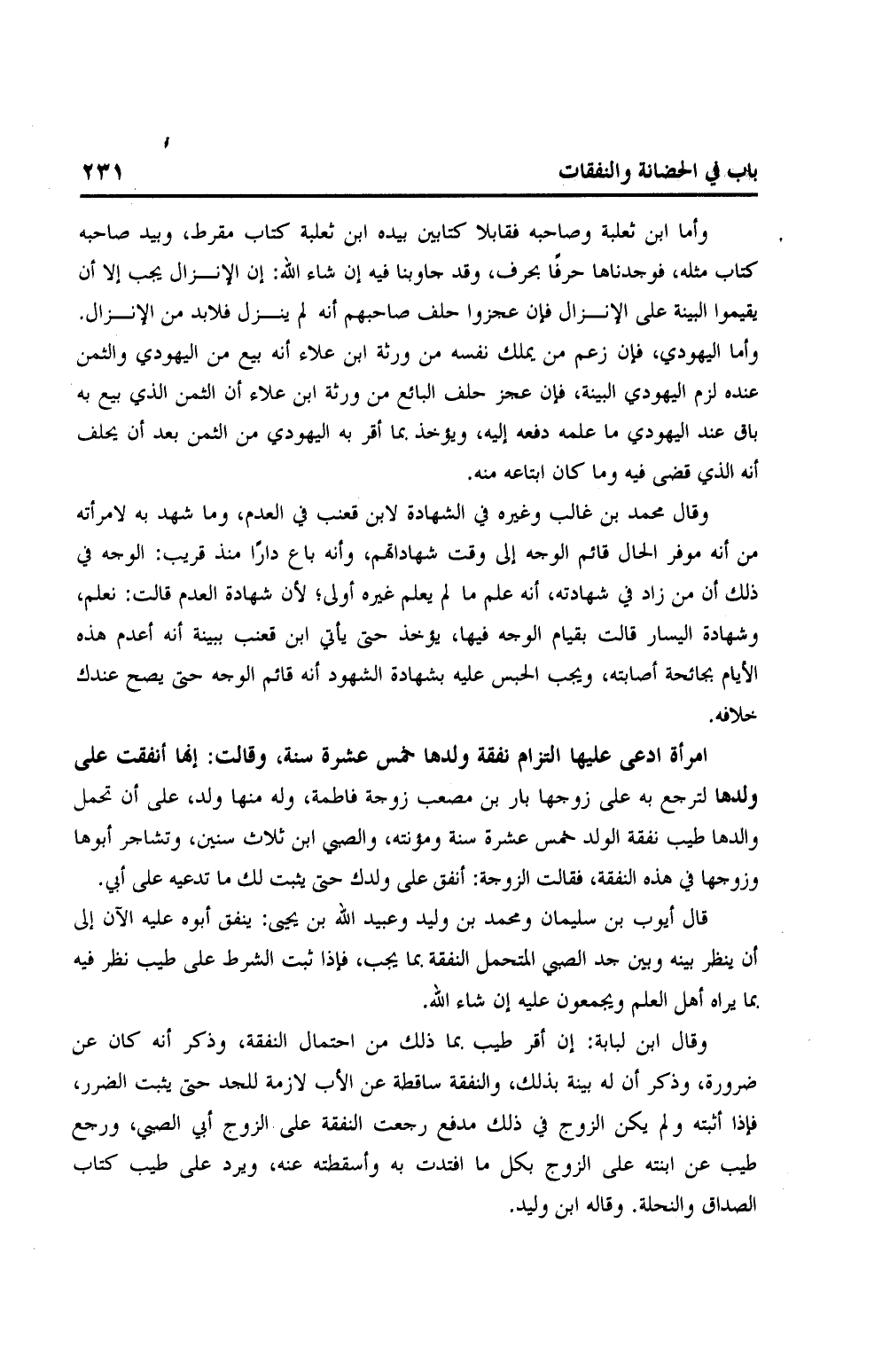 امرأة ادعى عليها التزام نفقة ولدها خمس عشرة سنة، وقالت: إنها أنفقت على ولدها لترجع به على زوجها بار بن مصعب زوجة فاطمة: وله منها ولد، على أن تحمل والدها طيب نفقة الولد خمس عشرة سنة ومؤنته، والصبي ابن ثلاث سنين، وتشاجر أبوها وزوجها في هذه النفقة، فقالت الزوجة: أنفق على ولدك حتى يثبت لك ما تدعيه على أبي.