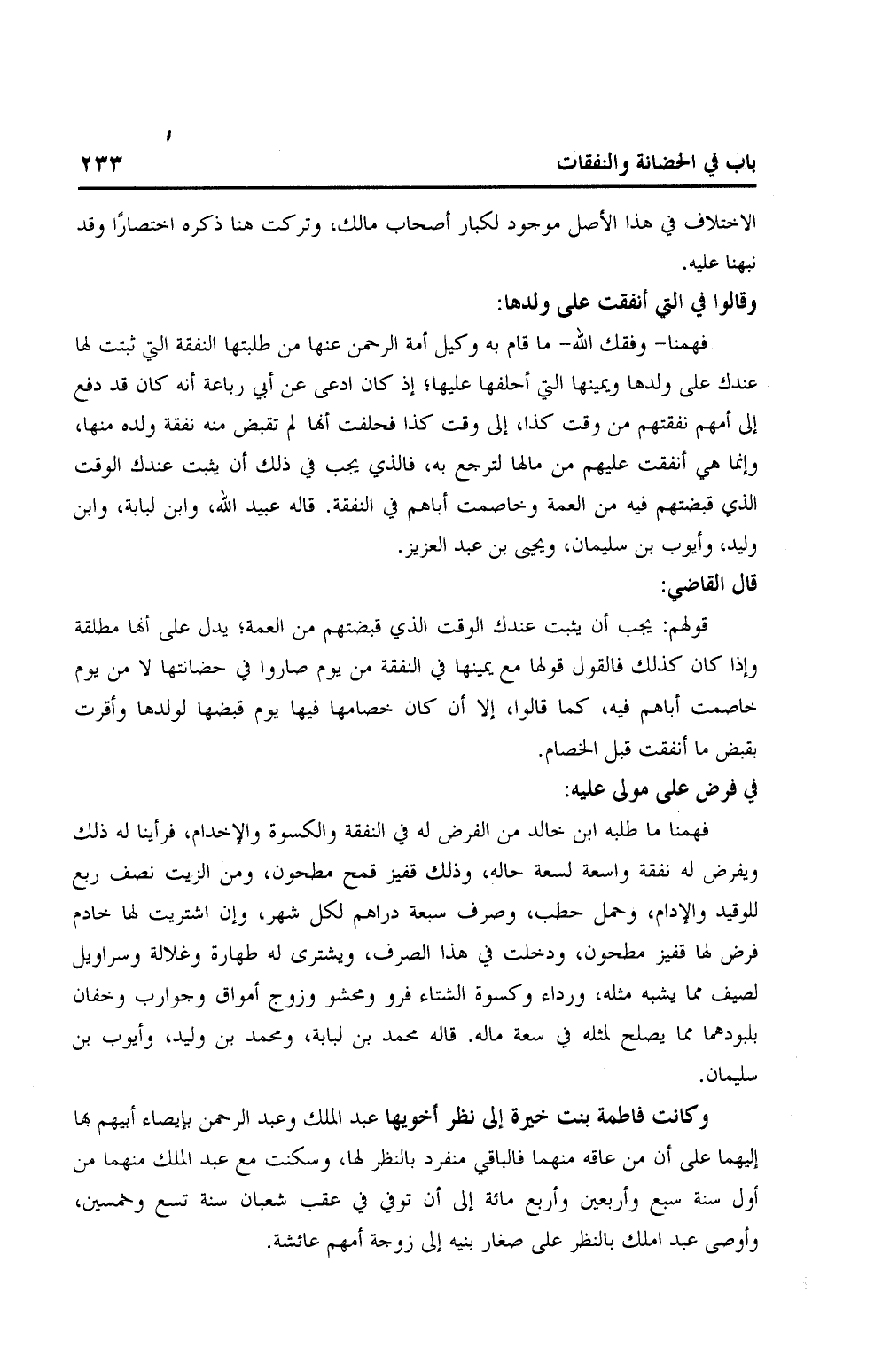 فهمنا ما طلبه ابن خالد من الفرض له في النفقة والكسوة والإخدام، فرأينا له ذلك ويفرض له نفقة واسعة لسعة حاله، وذلك قفيز قمح مطحون، ومن الزيت نصف ربع الموقيد والإدام، وحمل حطب، وصرف سبعة دراهم لكل شهر، وإن اشتريت لها خادم فرض لها قفيز مطحون، ودخلت في هذا الصرف، ويشتري له طهارة وغلالة وسراويل لصيف مما يشبه مثله، ورداء وكسوة الشتاء فرو ومحشو وزوج أمواق وجوارب وخفان بلبودهما مما يصلح لمثله في سعة ماله. قاله محمد بن لبابة، ومحمد بن وليد، وأيوب بن سليمان.