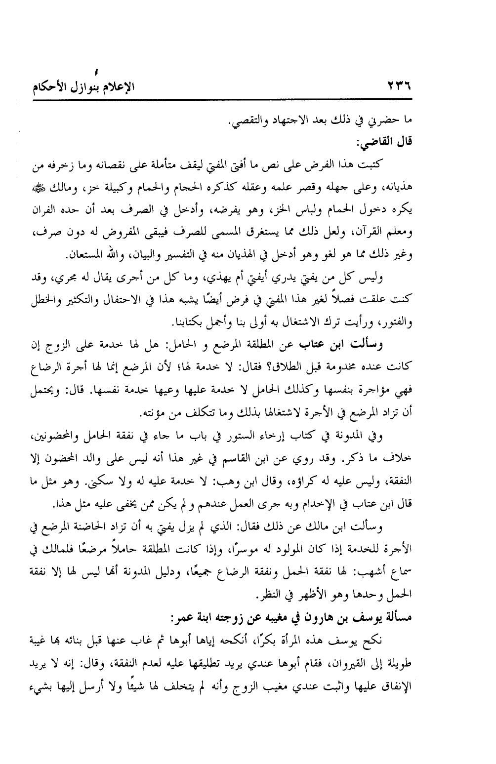 كتبت هذا الفرض على نص ما أفتى المفتي ليقف متأملة على نقصائه وما زخرفه من هذيانه، وعلى جهله وقصر علمه وعقله كذكره الحجام والحمام وكبيلة خز، ومالك رضي الله عنه يكره دخول الحمام ولباس الخز، وهو يفرضه، وأدخل في الصرف بعد أن حده الفران ومعلم القرآن، ولعل ذلك مما يستغرق المسمى للصرف فيبقى المفروض له دون صرف، وغير ذلك مما هو لغو وهو أدخل في الهذيان منه في التفسير والبيان، والله المستعان.