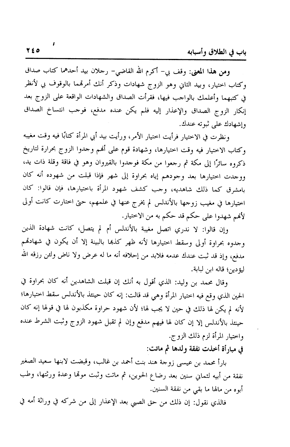 ونظرت في الاختيار فرأيت اختيار الأمر، ورأيت بيد أبي المرأة كتابًا فيه وقت مغيبة وكتاب الاختيار فيه وقت اختيارها، وشهادة قوم على أنهم وجدوا الزوج بحرارة لتاريخ ذكروه سائرًا إلى مكة ثم رجعوا من مكة فوجدوا بالقيروان وهو في فاقة وقلة ذات يد، ووجدت اختيارها بعد وجودهم إياه بحراوة إلى شهر فإذا قبلت من شهوده أنه كان بالمشرق كما ذلك شاهديه، وجب كشف شهود المرأة باختيارها، فإن قالوا: كان اختيارها في مغيب زوجها بالأندلس لم يخرج عنها في علمهم، حتى اختارت كانت أولى لأنهم شهدوا على حكم قد حكم به من الاختيار.
