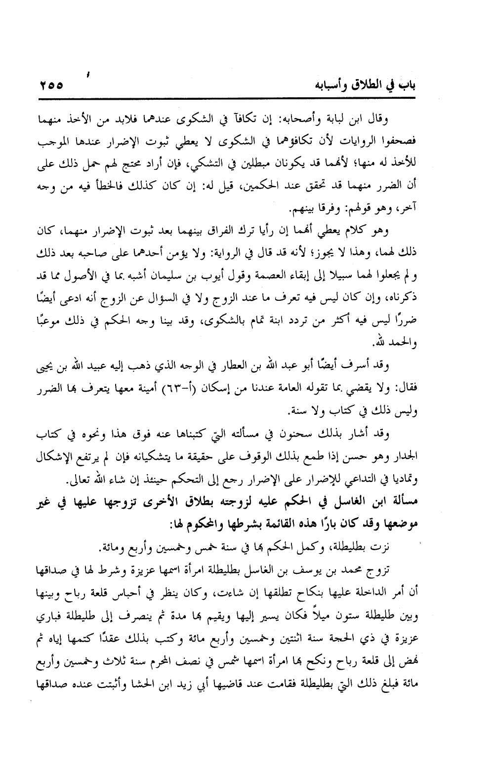 مسألة ابن الغاسل في الحكم عليه لزوجته بطلاق الأخرى تزوجها عليها في غير موضعها وقد كان بارًا هذه القائمة بشرطها والمحكوم لها: