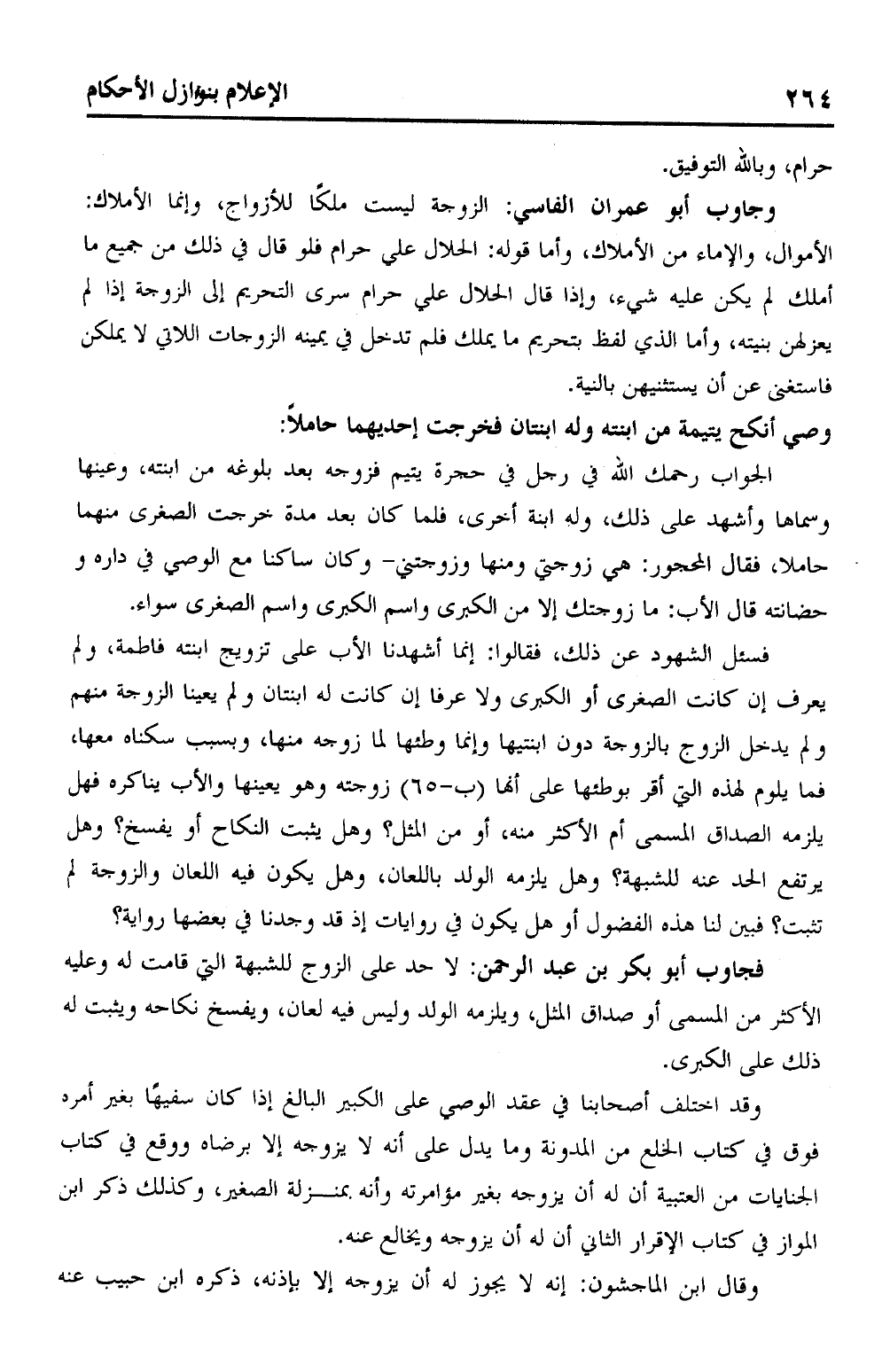 وجاوب ابو عمران الفاسي: الزوجة ليست ملكًا للأزواج، وإنما الأملاك: الأموال، والإماء من الأملاك، وأما قوله: الحلال علي حرام فلو قال في ذلك من جميع ما أملك لم يكن عليه شيء، وإذا قال الحلال علي حرام سرى التحريم إلى الزوجة إذا لم يعزلهن بنيته، وأما الذي لفظ بتحريم ما يملك فلم تدخل في يمينه الزوجات اللاتي لا يملكن فاستغنى عن أن يستثنيهن بالنية.
